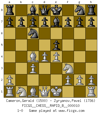 Last move : 1-0 2006 August 27 18:47:27 [Event "FICGS__CHESS__RAPID_B__000010"] [Site "FICGS"] [Date "2006.07.20"] [Round "1"] [White "Cameron,Gerald"] [Black "Zyryanov,Pavel"] [Result "1-0"] [WhiteElo "1500"] [BlackElo "1736"] 1.e4 e5 2.Nf3 Nc6 3.Bc4 Bc5 4.b4 Bxb4 5.c3 Be7 6.d4 1-0 This chess game has been lost on time (started : 2006.07.20 22:39:34) Evans gambit : 5...Be7 Player White won this chess game. Follow this game move after move (download)You need not play well - just help your opponent to play badly. (Genrikh Chepukaitis) Offensichtlich kennt Kasparow nichts anderes als Schach, und ich könnte 500 weitere Spieler dieser Sorte benennen. (Judith Polgar) El juego de Fischer siempre fue nítido, racional y brillante. Uno de los mejores por siempre. (Dave Regis) Donnez-moi un Cavalier en 6e et je gagnerais toutes mes parties. (Steinitz) It is not true that people stop pursuing dreams because they grow old, they grow old because they stop pursuing dreams. (Gabriel Garcia Marquez)