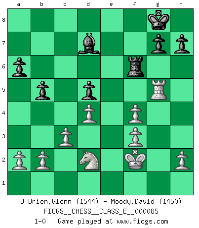 Last move : 1-0 2008 June 22 18:39:57 [Event "FICGS__CHESS__CLASS_E__000085"] [Site "FICGS"] [Date "2008.06.03"] [Round "1"] [White "O Brien,Glenn"] [Black "Moody,David"] [Result "1-0"] [WhiteElo "1544"] [BlackElo "1450"] 1.e4 e5 2.Nf3 Nc6 3.Bb5 a6 4.Ba4 Nf6 5.O-O Be7 6.Re1 b5 7.Bb3 O-O 8.c3 d5 9.exd5 Nxd5 10.Nxe5 Nxe5 11.Rxe5 c6 12.d4 Bd6 13.Re1 Qh4 14.g3 Qh3 15.Be3 Bg4 16.Qd3 Rae8 17.Nd2 f5 18.Bxd5+ cxd5 19.f3 f4 20.Bxf4 Bxf4 21.Rxe8 Rxe8 22.gxf4 Re6 23.Qf1 Bf5 24.Qxh3 Bxh3 25.Kf2 Rg6 26.Rg1 Rf6 27.Rg3 Bd7 28.Rg5 1-0 Ruy Lopez : Closed, 7...O-O Kingside Castling by player White (move 5) Kingside Castling by player Black (move 7) Player White won this chess game. Follow this game move after move (download)It is the aim of the modern school, not to treat every position according to one general law, but according to the principle inherent in the position. (Richard Reti) Im Leben werden Partien nie so unstrittig gewonnen wie im Spiel (Emanuel Lasker) Los tropiezos estan todos ahí en el tablero, esperando que se cometan. (Savielly Tartakover) Des idées, des idées, j'en ai cent, j'en ai mille. Des bonnes, des mauvaises, applicables, irréalisables... Il suffit de faire le tri ! (Roos) Life is pain my dear and anyone who says otherwise is selling something. (Princess Bride)
