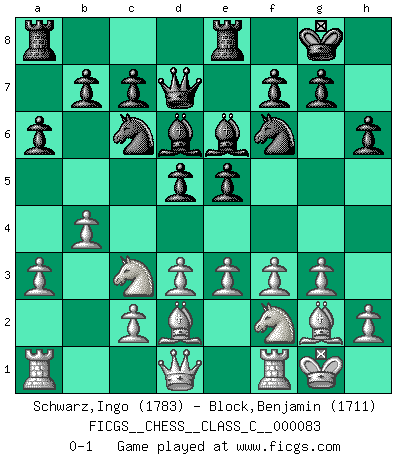 Last move : 0-1 2008 August 25 7:12:46 [Event "FICGS__CHESS__CLASS_C__000083"] [Site "FICGS"] [Date "2008.06.06"] [Round "1"] [White "Schwarz,Ingo"] [Black "Block,Benjamin"] [Result "0-1"] [WhiteElo "1783"] [BlackElo "1711"] 1.g3 e5 2.Bg2 d5 3.f3 Nc6 4.Nh3 Nf6 5.Nf2 Bc5 6.d3 O-O 7.O-O h6 8.Nc3 Be6 9.Bd2 Qd7 10.a3 a6 11.e3 Rfe8 12.b4 Bd6 0-1 Benko's Opening Kingside Castling by player Black (move 6) Kingside Castling by player White (move 7) Player Black won this chess game. Follow this game move after move (download)Nonsense was the last thing Fischer was interested in, as far as Chess was concerned. (Elie Agur) Sie führen leise Selbstgespräche, schlürfen lautstark ihre Getränke, schmatzen hörbar beim Essen, blasen ihrem Gegenüber Rauch in die Augen, niesen ihm ins Gesicht, starren ihn unverwandt an, bis er sich unter ihren Blicken windet, rutschen ständig auf ihrem Stuhl hin und her, rülpsen und bohren in der Nase. (Anonymous) Tu no necesitas jugar muy bien, únicamente ayudar a tu oponenet a que juegue muy mal. (Genrikh Chepukaitis) C'est la seule position que je connaisse où les deux camps sont mals. Propos prêtés à V. Anand. 98% of all statistics are made up. (Author unknown)