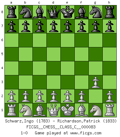 Last move : 1-0 2008 June 9 14:59:19 [Event "FICGS__CHESS__CLASS_C__000083"] [Site "FICGS"] [Date "2008.06.06"] [Round "1"] [White "Schwarz,Ingo"] [Black "Richardson,Patrick"] [Result "1-0"] [WhiteElo "1783"] [BlackElo "1833"] 1.g3 1-0 Benko's Opening Player White won this chess game. Follow this game move after move (download)All I want to do, ever, is just play Chess. (Bobby Fischer) Wenn du auf das Glück wartest, wird das Leben ziemlich langweilig. (Mikhail Nekhemyevich Tal) Los finales de Peón son del Ajedrez lo que el cesped es del Golf. (Cecil Purdy) À la honte des hommes, on sait que les lois du jeu sont les seules qui soient partout justes, claires, inviolables et exécutées. Pourquoi l'Indien qui a donné les règles du jeu d'échecs est-il obéi de bon gré dans toute la terre, et que les décrétales des papes, par exemple, sont aujourd'hui un objet d'horreur et de mépris ? C'est que l'inventeur des échecs combina tout avec justesse pour la satisfaction des joueurs, et que les papes, dans leurs décrétales, n'eurent en vue que leur seul avantage. L'Indien voulut exercer également l'esprit des hommes et leur donner du plaisir; les papes ont voulu abrutir l'esprit des hommes. Voltaire (Dictionnaire philosophique / Garnier 1967) A woman without a man is like a fish without a bicycle. (Gloria Steinem)