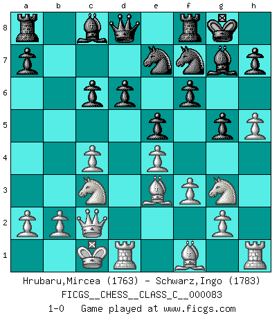 Last move : 1-0 2008 August 25 7:11:59 [Event "FICGS__CHESS__CLASS_C__000083"] [Site "FICGS"] [Date "2008.06.06"] [Round "1"] [White "Hrubaru,Mircea"] [Black "Schwarz,Ingo"] [Result "1-0"] [WhiteElo "1763"] [BlackElo "1783"] 1.e4 g6 2.d4 Bg7 3.c4 f6 4.f3 Nh6 5.Be3 Nf7 6.Nc3 d6 7.h4 Nc6 8.Nge2 e5 9.h5 g5 10.d5 Ne7 11.Ng3 O-O 12.Qc2 c5 13.dxc6 bxc6 14.O-O-O 1-0 Robatsch (Modern) defense Kingside Castling by player Black (move 11) Queenside Castling by player White (move 14) Player White won this chess game. Follow this game move after move (download)The laws of Chess do not permit a free choice: you have to move whether you like it or not. (Emanuel Lasker) Die Partien sind immer verschieden, die Interviews immer die gleichen. (Garry Kasparov) El hombre es un frívolo, una creatura engañosa y como un jugador de Ajedrez, se preocupa mas por el proceso de obtener su meta que de la meta por sí misma. (Dostoyevsky) Le génie consiste à savoir transgresser les règles au moment opportun. (Teichmann) It's unlucky to be superstitious. (Dave Enteles)