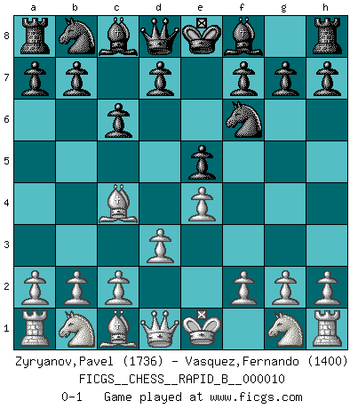 Last move : 0-1 2006 August 30 6:54:45 [Event "FICGS__CHESS__RAPID_B__000010"] [Site "FICGS"] [Date "2006.07.20"] [Round "1"] [White "Zyryanov,Pavel"] [Black "Vasquez,Fernando"] [Result "0-1"] [WhiteElo "1736"] [BlackElo "1400"] 1.e4 e5 2.Bc4 Nf6 3.d3 c6 0-1 This chess game has been lost on time (started : 2006.07.20 22:39:34) Bishop's Opening : Berlin defense Player Black won this chess game. Follow this game move after move (download)Later, I began to succeed in decisive games. Perhaps because I realized a very simple truth: not only was I worried, but also my opponent. (Mikhail Tal) Im Spitzenschach von heute geht es nur um Vorbereitung, um tiefgründige, sorgfältige Eröffnungsvorbereitung. (Nigel Short) La esencia del Ajedrez es pensar acerca de lo que el Ajedrez es. (David Bronstein) Botvinnik disait en comparant les échecs à la musique: Il existe une science dont le but est l'étude de l'acoustique et des sons. Mais il y a aussi un art qui se sert de l'océan des sons : c'est la musique. De toute évidence, il en est de même pour la pensée. La logique est l'étude des lois de la réflexion et les échecs reflètent, en tant qu'art, le côté logique de la réflexion, sous la forme d'images artistiques... Extrait de Fischer - Spassky, Reykjavik 1972 par Alexander & F. Wyndham (Ed. Solar), p 37. The hypothalamus is one of the most important parts of the brain, involved in many kinds of motivation, among other functions. The hypothalamus controls the 'Four Fs: Fighting, Fleeing, Feeding and Mating. (Unknown author)