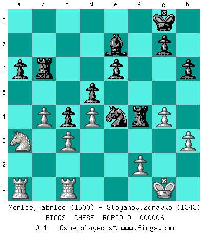 Last move : 0-1 2008 August 15 6:6:34 [Event "FICGS__CHESS__RAPID_D__000006"] [Site "FICGS"] [Date "2008.06.06"] [Round "1"] [White "Morice,Fabrice"] [Black "Stoyanov,Zdravko"] [Result "0-1"] [WhiteElo "1500"] [BlackElo "1343"] 1.e4 c6 2.d4 e6 3.Nf3 h6 4.Be2 d5 5.e5 c5 6.O-O c4 7.a3 b5 8.Bd2 Nc6 9.b3 Nge7 10.b4 Nf5 11.c3 Be7 12.Re1 O-O 13.a4 Rb8 14.axb5 Rxb5 15.Qa4 a6 16.Na3 Rb6 17.Reb1 Qd7 18.g4 Nh4 19.Bd1 Nb8 20.Qxd7 Nxf3+ 21.Bxf3 Bxd7 22.Bd1 f6 23.Bf4 Nc6 24.Ba4 Nb8 25.Bxd7 Nxd7 26.exf6 Nxf6 27.h3 Ne4 28.Rc1 Rxf4 0-1 This chess game has been lost on time (started : 2008.06.06 19:55:56) Caro-Kann defense Kingside Castling by player White (move 6) Kingside Castling by player Black (move 12) Player Black won this chess game. Follow this game move after move (download)There must have been a time when men were demigods, or they could not have invented Chess. (Gustav Schenk) Es genügt nicht ein guter Spieler zu sein, man muß auch gut spielen. (Siegbert Tarrasch) La mitad de las variaciones que son calculadas en una partida de torneo, resultan ser completamente superfluas. Desafortunadamente, nadie sabe por adelantado cual mitad. (Jan Tinman) Même si vous avez un bon coup à faire, regardez toujours s'il n'y en a pas un qui lui soit préférable. (Pedro Damiano) Inventor: A person who makes an ingenious arrangement of wheels, levers and springs, and believes it civilization. (Ambrose Bierce, The Devil's Dictionary)