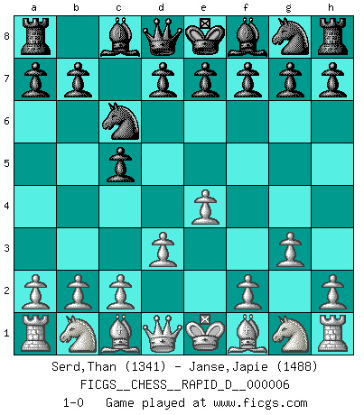 Last move : 1-0 2008 July 10 14:47:39 [Event "FICGS__CHESS__RAPID_D__000006"] [Site "FICGS"] [Date "2008.06.06"] [Round "1"] [White "Serd,Than"] [Black "Janse,Japie"] [Result "1-0"] [WhiteElo "1341"] [BlackElo "1488"] 1.e4 c5 2.d3 Nc6 3.g3 1-0 This chess game has been lost on time (started : 2008.06.06 19:55:56) Sicilian defense Player White won this chess game. Follow this game move after move (download)My God, Bobby Fischer plays so simply. (Alexei Suetin) Es ist peinlich, dass ich nie Weltmeister wurde. Es wäre leicht, Leonid Breschnjew als Ursache vorzuschieben, dessen Apparat den Vorzeigekommunisten Anatoli Karpow in allem unterstützte. Aber Garri Kasparow zum Beispiel, der ebenfalls von den Sowjets unerwünscht war, hat trotz der Widerstände den WM-Titel erobert. (Viktor Kortschnoi) No todos los artistas son jugadores de Ajedrez, pero todos los jugadores de Ajedrez son artistas. (Marcel Duchamp) Dieu déplace le joueur, et celui-ci la pièce. Quel Dieu derrière Dieu commence donc la trame ? Arturo Perez-Reverte (prix de littérature policière 1993). Control your own destiny or someone else will. (Jack Welch)