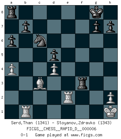 Last move : 0-1 2008 June 22 9:44:25 [Event "FICGS__CHESS__RAPID_D__000006"] [Site "FICGS"] [Date "2008.06.06"] [Round "1"] [White "Serd,Than"] [Black "Stoyanov,Zdravko"] [Result "0-1"] [WhiteElo "1341"] [BlackElo "1343"] 1.e4 e6 2.d4 c6 3.c4 Qa5+ 4.Bd2 Bb4 5.Nc3 Ne7 6.a3 Bxc3 7.Bxc3 Qc7 8.Nf3 O-O 9.Bd3 d5 10.O-O f5 11.exf5 Nxf5 12.b4 a6 13.Re1 Qf7 14.Ne5 Qf6 15.a4 dxc4 16.Bxc4 Nd6 17.Bb3 Qxf2+ 18.Kh1 Nf5 19.Nf3 Ne3 20.Qe2 Qxe2 21.Rxe2 Nd5 22.Bxd5 exd5 23.b5 Bg4 24.bxc6 Nxc6 25.Rb1 Bxf3 26.gxf3 Rxf3 0-1 French defense Kingside Castling by player Black (move 8) Kingside Castling by player White (move 10) Player Black won this chess game. Follow this game move after move (download)I like to say that Bobby Fischer was the greatest player ever. But what made Fischer a genius was his ability to blend an American freshness and pragmatism with Russian ideas about strategy. (Bruce Pandolfini) Obwohl ich vom Stil her kaum zu den Priestern der Schachkunst gezählt werde, halte ich Schach doch für eine Kunst. (Tigran Petrosjan) Un buen jugador siempre tiene buena suerte. (José Raúl Capablanca) L'ordinateur a tué l'originalité. Il n'y a plus guère d'aventures sur l'échiquier. (Jacob Murray) Opportunities multiply as they are seized. (Sun Tzu)