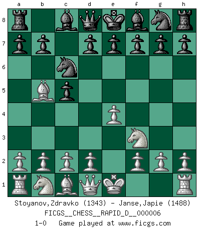 Last move : 1-0 2008 July 10 14:47:39 [Event "FICGS__CHESS__RAPID_D__000006"] [Site "FICGS"] [Date "2008.06.06"] [Round "1"] [White "Stoyanov,Zdravko"] [Black "Janse,Japie"] [Result "1-0"] [WhiteElo "1343"] [BlackElo "1488"] 1.e4 c5 2.Nf3 Nc6 3.Bb5 1-0 This chess game has been lost on time (started : 2008.06.06 19:55:56) Sicilian : Nimzovich-Rossolimo attack (without ...d6) Player White won this chess game. Follow this game move after move (download)Chess is in its essence a game, in its form an art, and in its execution a science. (Baron Tassilo) Schach wird sich dank seiner hohen kulturellen Tradition immer durchsetzen. In näherer Zukunft womöglich sogar als Gegenreaktion auf die maßlose Reizüberflutung im Freizeit- und Spielbereich. (Garry Kasparov) En el Ajedrez, tal como en la vida, las bendiciones de hoy pueden ser el veneno del mañana. (Assaic) Vouloir jouer aux échecs contre soi-même est aussi paradoxal que vouloir marcher sur son ombre. (Stefan Zweig) Empty your mind, be formless, shapeless — like water. (Bruce Lee)