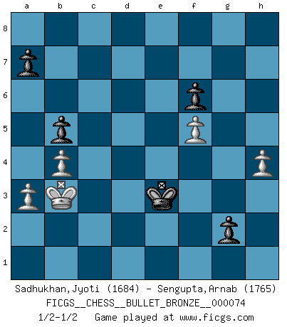 Last move : 1/2-1/2 2008 June 6 22:28:39 [Event "FICGS__CHESS__BULLET_BRONZE__000074"] [Site "FICGS"] [Date "2008.06.06"] [Round "1"] [White "Sadhukhan,Jyoti"] [Black "Sengupta,Arnab"] [Result "1/2-1/2"] [WhiteElo "1684"] [BlackElo "1765"] 1.e4 e5 2.d3 Nf6 3.Nc3 d5 4.f3 Bb4 5.Bd2 dxe4 6.dxe4 Bxc3 7.Bxc3 Qxd1+ 8.Rxd1 Nc6 9.Bb5 Bd7 10.Bxc6 Bxc6 11.Bxe5 O-O 12.Bxc7 Bb5 13.Ne2 Bxe2 14.Kxe2 Rfc8 15.Be5 Rxc2+ 16.Rd2 Rxd2+ 17.Kxd2 Nd7 18.Bc3 Rc8 19.Rd1 f6 20.Kc2 Nc5 21.Bd4 Ne6 22.Bc3 Nc5 23.b4 Na4 24.Kb3 Rxc3+ 25.Kxa4 Rc7 26.a3 Kf7 27.Rd3 Ke6 28.Kb3 Rc1 29.h3 h5 30.f4 Re1 31.f5+ Ke5 32.Rd7 b5 33.Rxg7 Re3+ 34.Ka2 Kxe4 35.Re7+ Kf4 36.Rxe3 Kxe3 37.Kb3 h4 38.g3 hxg3 39.h4 g2 1/2-1/2 Variation Indian Opening : Indian Opening Kingside Castling by player Black (move 11) 10 pieces endgame at move 38 : White KPPPP , Black KPPPP WHITE : King + 4 Pawns BLACK : King + 4 Pawns This chess game ended in a draw. Follow this game move after move (download)On the chessboard, lies and hypocrisy do not survive long. (Emanuel Lasker) Spielt Blackmar-Diemer-Gambit, und das Matt kommt von selbst! (Emil Joseph Diemer) El jugador blanco perdió porque fallo en recordar la coreccta continuación y tuvo que pensar por sí mismo las movidas. (Siegbert Tarrasch) Toute estimation doit être constamment réévaluée. (Jacob Estrin) Animated gif is worth one mega-word. (Unknown)