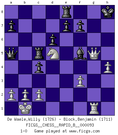 Last move : 1-0 2008 July 26 11:20:54 [Event "FICGS__CHESS__RAPID_B__000093"] [Site "FICGS"] [Date "2008.06.09"] [Round "1"] [White "De Waele,Willy"] [Black "Block,Benjamin"] [Result "1-0"] [WhiteElo "1726"] [BlackElo "1711"] 1.e4 c5 2.Nf3 d6 3.d4 cxd4 4.Nxd4 Nf6 5.Nc3 g6 6.Be3 Bg7 7.f3 Nc6 8.Qd2 O-O 9.Bc4 Bd7 10.Bb3 Rc8 11.O-O-O Ne5 12.h4 h5 13.Bg5 Rc5 14.Kb1 Re8 15.Bh6 Qa5 16.Bxg7 Kxg7 17.Rhe1 b5 18.f4 Nc4 19.Bxc4 bxc4 20.f5 gxf5 21.Qg5+ Kh7 22.Nd5 Nxe4 23.Qxh5+ Kg7 24.Rxe4 fxe4 25.Qg5+ Kh8 26.Nf3 exf3 27.gxf3 Bf5 28.Rg1 1-0 Sicilian : Dragon, Yugoslav attack Kingside Castling by player Black (move 8) Queenside Castling by player White (move 11) Player White won this chess game. Follow this game move after move (download)Is Bobby Fischer quite sane ? (Salo Flohr) Immer nach dem besten Zug zu suchen ist ziemlich unpraktisch. (Nigel Short) Buenas posiciones no logran ganar juegos, buenas movidas sí. (Gerald Abrahams) Karpov est une pièce de musée. (Garry Kasparov) Luck never made a man wise. (Seneca, Letters to Lucilius)