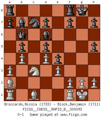 Last move : 0-1 2008 June 17 12:5:16 [Event "FICGS__CHESS__RAPID_B__000093"] [Site "FICGS"] [Date "2008.06.09"] [Round "1"] [White "Broccardo,Nicola"] [Black "Block,Benjamin"] [Result "0-1"] [WhiteElo "1733"] [BlackElo "1711"] 1.c4 Nf6 2.Nc3 e5 3.e3 Bb4 4.Nd5 Nxd5 5.cxd5 O-O 6.Bc4 c6 7.Ne2 Na6 8.a3 b5 9.Ba2 Bd6 10.O-O Bb7 11.d4 Qb6 12.b4 cxd5 13.Bb2 e4 14.Nc3 Nc7 15.Qh5 g6 16.Bc1 gxh5 0-1 English Opening Kingside Castling by player Black (move 5) Kingside Castling by player White (move 10) Player Black won this chess game. Follow this game move after move (download)Let the perfectionist play postal. (Yasser Seirawan) Ohne ihre Erfolge schmälern zu wollen würde ich sagen Petrosian, Spassky und Karpov verdanken ihre Siege ihren Trainern - Boleslavsky, Bondarevsky und Furman. (Mikhail Moiseyevich Botvinik) Peones: ellos son el alma de esta partida, solos forman el ataque y la defensa. (Philidor) Aucun coup ne doit être joué sans but. (Pedro Damiano) An expert is a man who has made all the mistakes which can be made in a very narrow field. (Niels Bohr)