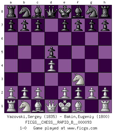 Last move : 1-0 2008 July 11 14:49:0 [Event "FICGS__CHESS__RAPID_B__000093"] [Site "FICGS"] [Date "2008.06.09"] [Round "1"] [White "Vazovski,Sergey"] [Black "Bakin,Eugeniy"] [Result "1-0"] [WhiteElo "1835"] [BlackElo "1800"] 1.d4 d5 2.Nf3 1-0 This chess game has been lost on time (started : 2008.06.09 11:21:43) Queen's pawn game Player White won this chess game. Follow this game move after move (download)Suddenly it was obvious to me in my analysis I had missed what Fischer had found with the greatest of ease at the board. (Mikhail Botvinnik) Kleine Schachspieler machen Mist, und große Schachspieler machen Mist, aber große machen weniger Mist. (Fritz Sämisch) Cuando veas una buena jugada, trata de encontrar otra mejor. (Emanuel Lasker) Le joueur d'Echecs qui veut atteindre le top est obligé de développer son propre credo créatif. Alexeï Stepanovicth Souétine. Il est facile d'écrire des livres ! Ce qui est difficile, c'est de jouer ! (Alexeï Stepanovicth Souétine) Wawaweewa ! (Borat: Cultural learnings of America for make benefit glorious nation of Kazakhstan)