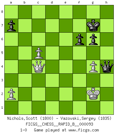Last move : 1-0 2008 September 7 17:57:23 [Event "FICGS__CHESS__RAPID_B__000093"] [Site "FICGS"] [Date "2008.06.09"] [Round "1"] [White "Nichols,Scott"] [Black "Vazovski,Sergey"] [Result "1-0"] [WhiteElo "1800"] [BlackElo "1835"] 1.e4 e6 2.d4 d5 3.Nd2 dxe4 4.Nxe4 Nd7 5.Nf3 Ngf6 6.Bg5 Be7 7.Nxf6+ Bxf6 8.Bxf6 Nxf6 9.Bd3 O-O 10.Ne5 c5 11.dxc5 Qa5+ 12.c3 Qxc5 13.Qe2 b6 14.O-O Bb7 15.Rad1 Rad8 16.Rfe1 g6 17.Bc2 Qc7 18.Qe3 Rxd1 19.Rxd1 Rd8 20.Rxd8+ Qxd8 21.Qf4 Qd5 22.f3 Kg7 23.c4 Qa5 24.Kf2 Qc5+ 25.Kf1 Qe7 26.Qd4 Kg8 27.b4 Ne8 28.Ba4 Nd6 29.g4 f6 30.c5 Ne8 31.Nc6 Qc7 32.Nd8 Bd5 33.Bxe8 Qxd8 34.Bc6 bxc5 35.bxc5 Kf7 36.h4 h5 37.Kf2 hxg4 38.fxg4 Qh8 39.Bxd5 Qxh4+ 40.Kg2 exd5 41.Qxd5+ Kg7 42.Qc4 1-0 French : Tarrasch Kingside Castling by player Black (move 9) Kingside Castling by player White (move 14) 10 pieces endgame at move 41 : White KQPPP , Black KQPPP WHITE : King + 1 Queen 3 Pawns BLACK : King + 1 Queen 3 Pawns Player White won this chess game. Follow this game move after move (download)The passion for playing Chess is one of the most unaccountable in the world. (H.G. Wells) Ja, jede Frau in Holland liebt mich bestimmt, und alle Männer hassen mich. (Loek van Wely) Bobby es el jugador de Ajedrez mas fino que este país jamás haya producido. Su memoria para las movidas, su brillantez en soñar combinaciones y su feróz determinación por la victoria son algo extraño. (John Collins) Mais n'est-ce pas déjà le limiter injurieusement que d'appeler les échecs un jeu? N'est-ce pas aussi une science, un art, ou quelque chose qui, comme le cercueil de Mahomet entre ciel et terre, est suspendu entre l'un et l'autre, et qui réunit un nombre incroyable de contraires ? (Stefan Zweig) Computers have lots of memory but no imagination. (Anonymous)
