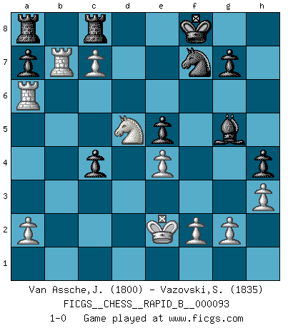 Last move : 1-0 2008 September 19 16:48:5 [Event "FICGS__CHESS__RAPID_B__000093"] [Site "FICGS"] [Date "2008.06.09"] [Round "1"] [White "Van Assche,Jeroen"] [Black "Vazovski,Sergey"] [Result "1-0"] [WhiteElo "1800"] [BlackElo "1835"] 1.e4 c5 2.d4 cxd4 3.c3 dxc3 4.Nxc3 Nc6 5.Nf3 d6 6.Bc4 e6 7.O-O Nf6 8.Qe2 Be7 9.Rd1 e5 10.Be3 O-O 11.Rac1 Be6 12.Bxe6 fxe6 13.b4 Ng4 14.Bc5 b6 15.b5 bxc5 16.bxc6 Qb6 17.Qc4 Kf7 18.h3 Nh6 19.Ng5+ Bxg5 20.Rxd6 Kg8 21.Rb1 Qc7 22.Qxe6+ Qf7 23.Rb7 Qxe6 24.Rxe6 Nf7 25.c7 c4 26.Rc6 h5 27.Nd5 h4 28.Kf1 Rfc8 29.Ke2 Kf8 30.Ra6 1-0 Sicilian : Smith-Morra gambit Kingside Castling by player White (move 7) Kingside Castling by player Black (move 10) Player White won this chess game. Follow this game move after move (download)I'm not a materialistic person, in that, I don't suffer the lack or loss of money. The absence of worldly goods I don't look back on. For Chess is a way I can be as materialistic as I want without having to sell my soul. (Jamie Walter Adams) Modernes Schach erfordert enorme Anspannung. Es ist für einen normalen Menschen unmöglich das auszuhalten. (Viktor Kortschnoi) No volvere nunca a jugar contigo. Has insultado a mi amigo. - cuando un oponente se maldijo por una mala jugada (Miguel Najdorf) Demandez au pauvre Cg1 ce qu'il en pense. Eduard Gufeld à propos de la variante Saemisch de l'Est-Indienne. Chess is as much a mystery as women. (Purdy)