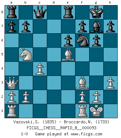 Last move : 1-0 2008 June 17 16:5:51 [Event "FICGS__CHESS__RAPID_B__000093"] [Site "FICGS"] [Date "2008.06.09"] [Round "1"] [White "Vazovski,Sergey"] [Black "Broccardo,Nicola"] [Result "1-0"] [WhiteElo "1835"] [BlackElo "1733"] 1.d4 Nf6 2.Nf3 d6 3.c4 g6 4.Nc3 Bg7 5.e4 O-O 6.Be2 c6 7.O-O Bg4 8.Be3 e6 9.h3 Bxf3 10.Bxf3 Nbd7 11.Qd3 c5 12.e5 dxe5 13.dxc5 Qc7 14.Nb5 Nxc5 15.Qa3 Qb8 16.Bxc5 Re8 17.Bd6 Qc8 18.Bxe5 1-0 Queen's pawn game Kingside Castling by player Black (move 5) Kingside Castling by player White (move 7) Player White won this chess game. Follow this game move after move (download)Fischer is under obligation to nobody. (Joseph Platz) Du musst nicht gut spielen, es reicht, wenn du besser spielst als dein Gegner. (Anonymous) El poder defensivo de una pieza clavada, solamente es imaginario. (Aaron Nimzovich) Il a essayé de se convaincre qu'il pourrait empêcher toutes les erreurs et ne jamais perdre. L'horreur ! Gary Kasparov au sujet de Robert Fischer. When you have everything, sometimes it feels like nothing. (Horatio Caine, C.S.I. Miami)