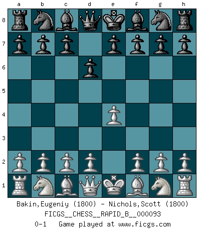 Last move : 0-1 2008 July 10 14:47:39 [Event "FICGS__CHESS__RAPID_B__000093"] [Site "FICGS"] [Date "2008.06.09"] [Round "1"] [White "Bakin,Eugeniy"] [Black "Nichols,Scott"] [Result "0-1"] [WhiteElo "1800"] [BlackElo "1800"] 1.e4 d6 0-1 This chess game has been lost on time (started : 2008.06.09 11:21:43) King's pawn Opening Player Black won this chess game. Follow this game move after move (download)A good sacrifice is one that is not necessarily sound but leaves your opponent dazed and confused. (Rudolph Spielmann) Wir irren allesamt, nur jeder irrt anders. (Georg Christoph Lichtenberg) Prefiero perder una partida realmente buena, que ganar una mala. (David Levy) Pour se monter efficace, un Cavalier a besoin d'avant-postes ! Les Cavaliers font les meilleurs bloqueurs de pions passés. Man with more than one clock never knows what time it is. (Chinese thought)