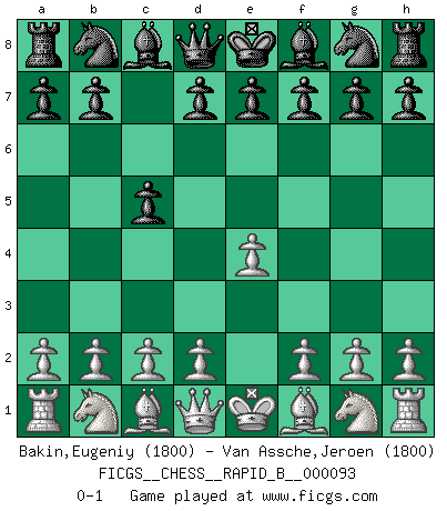 Last move : 0-1 2008 July 11 14:49:0 [Event "FICGS__CHESS__RAPID_B__000093"] [Site "FICGS"] [Date "2008.06.09"] [Round "1"] [White "Bakin,Eugeniy"] [Black "Van Assche,Jeroen"] [Result "0-1"] [WhiteElo "1800"] [BlackElo "1800"] 1.e4 c5 0-1 This chess game has been lost on time (started : 2008.06.09 11:21:43) Sicilian defense Player Black won this chess game. Follow this game move after move (download)The King is a fighting piece. Use it ! (Wilhelm Steinitz) Ein Teil des Fehlers ist immer korrekt. (Savielly Grigorievitsch Tartakower) Yo no creo en la psicología. Yo creo en las buenas movidas. (Bobby Fischer) La tactique est l'élément le plus important du milieu de jeu. (Siegbert Tarrasch) Two beer, or not two beer. (Unknown)
