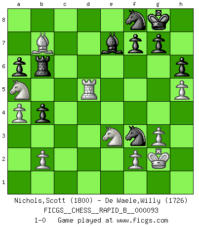 Last move : 1-0 2008 June 23 9:50:44 [Event "FICGS__CHESS__RAPID_B__000093"] [Site "FICGS"] [Date "2008.06.09"] [Round "1"] [White "Nichols,Scott"] [Black "De Waele,Willy"] [Result "1-0"] [WhiteElo "1800"] [BlackElo "1726"] 1.e4 c5 2.d4 cxd4 3.c3 dxc3 4.Nxc3 e6 5.Nf3 a6 6.Bc4 Nc6 7.O-O Nge7 8.Bg5 d6 9.Qe2 h6 10.Be3 b5 11.Bb3 Na5 12.Rfd1 Bb7 13.Bc2 Nc4 14.Bc1 Rc8 15.Bd3 Na5 16.Be3 Ng6 17.h4 Nc6 18.a4 b4 19.Na2 Qa5 20.Nc1 Ra8 21.Nb3 Qh5 22.Rac1 Be7 23.g3 O-O 24.Nfd2 Qxe2 25.Bxe2 d5 26.exd5 exd5 27.Bf3 Rfd8 28.Bb6 Rd7 29.Nf1 Nce5 30.Bg2 Rc8 31.Rxc8+ Bxc8 32.Bh3 Rd6 33.Bxc8 Rxb6 34.h5 Nf8 35.Ne3 Rc6 36.Bb7 Rd6 37.Rxd5 Rb6 38.Bc8 Nf3+ 39.Kg2 Rc6 40.Bb7 Rb6 41.Na5 1-0 Sicilian : Smith-Morra gambit Kingside Castling by player White (move 7) Kingside Castling by player Black (move 23) Player White won this chess game. Follow this game move after move (download)The Pawns are the soul of the game. (Francois Andre Danican Philidor) Lisa Lane, amerikanische Schachmeisterin, hatte Fischer einmal als stärksten lebenden Spieler bezeichnet. Antwort: Das ist richtig, aber Lisa Lane ist eigentlich nicht in der Lage, das zu beurteilen. (Robert James Fischer) Las ideas audaces son como las piezas del Ajedrez que avanzan hacia adelante. Ellas pueden ser vencidas, pero también pueden iniciar una partida victoriosa. (Goethe) Psychologiquement, tu dois avoir confiance en toi même, mais cette confiance doit être basée sur des faits. (Robert Fischer) The quality of decision is like the well-timed swoop of a falcon which enables it to strike and destroy its victim. (Sun Tzu)