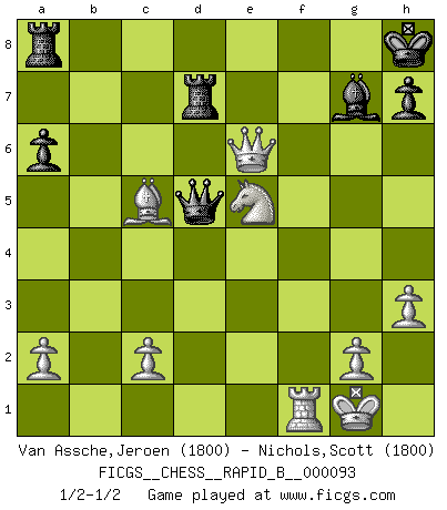 Last move : 1/2-1/2 2008 July 14 2:1:2 [Event "FICGS__CHESS__RAPID_B__000093"] [Site "FICGS"] [Date "2008.06.09"] [Round "1"] [White "Van Assche,Jeroen"] [Black "Nichols,Scott"] [Result "1/2-1/2"] [WhiteElo "1800"] [BlackElo "1800"] 1.e4 d6 2.d4 Nf6 3.Nc3 g6 4.f4 Bg7 5.Nf3 c5 6.Bb5+ Bd7 7.e5 Ng4 8.Bxd7+ Qxd7 9.d5 dxe5 10.h3 e4 11.Nxe4 Nf6 12.Nxf6+ Bxf6 13.O-O O-O 14.Be3 Bxb2 15.Rb1 Bg7 16.Bxc5 Rd8 17.Ne5 Qc7 18.Rb5 Nc6 19.Qf3 a6 20.Rxb7 Qxb7 21.Nxc6 Rd7 22.f5 gxf5 23.Qxf5 e6 24.dxe6 fxe6 25.Qxe6+ Kh8 26.Ne5 Qd5 1/2-1/2 Pirc : Austrian attack, Dragon formation Kingside Castling by player White (move 13) Kingside Castling by player Black (move 13) This chess game ended in a draw. Follow this game move after move (download)We don't really know how the game was invented, though there are suspicions. As soon as we discover the culprits, we'll let you know. (Bruce Pandolfini) Die jungen Leute sollen verstehen, dass sie noch etwas von mir lernen können und müssen. (Viktor Kortschnoi) Morphy probablemente fue el genio más grande de todos. (Bobby Fischer) Dans le domaine de la peinture, de la gravure et de la sculpture, dès la première décennie de notre siècle, les artistes abandonnent la représentation de la partie d'échecs pour se concentrer sur les pièces, sur les échiquiers et sur toutes les variations auxquelles les unes et les autres peuvent donner lieu. On passe en quelque sorte d'un thème social à un thème musical (au sens de la musica médiévale, c'est-à-dire d'une notion qui inclue le rythme, l'harmonie, la construction et la déconstruction, etc.). Graphiquement et picturalement, l'échiquier apparaît comme une structure ouverte, dynamique, d'une richesse infinie, autorisant toutes les combinatoires et débouchant sur des mouvements et des rythmes de nature exponentielle. (Michel Pastoureau) If I had no sense of humor, I would long ago have committed suicide. (Mahatma Gandhi)