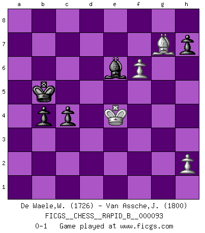Last move : 0-1 2008 July 30 21:21:41 [Event "FICGS__CHESS__RAPID_B__000093"] [Site "FICGS"] [Date "2008.06.09"] [Round "1"] [White "De Waele,Willy"] [Black "Van Assche,Jeroen"] [Result "0-1"] [WhiteElo "1726"] [BlackElo "1800"] 1.e4 d5 2.exd5 Nf6 3.d4 Bg4 4.f3 Bf5 5.Bb5+ Nbd7 6.c4 a6 7.Bxd7+ Qxd7 8.Ne2 e6 9.dxe6 Qxe6 10.b3 O-O-O 11.O-O Bc5 12.Kh1 b5 13.d5 Nxd5 14.cxd5 Rxd5 15.Qe1 b4 16.Nf4 Qxe1 17.Rxe1 Rd6 18.Bb2 Rhd8 19.Bxg7 Bf2 20.Rf1 Be3 21.g3 f6 22.a3 Rd1 23.Nd2 R1xd2 24.axb4 R8d6 25.Rfe1 Bxf4 26.gxf4 Kb7 27.Rac1 Bd7 28.f5 Rb2 29.Rb1 Rf2 30.Rf1 Rfd2 31.Bh6 R2d3 32.Kg2 Bc6 33.Rbe1 R6d4 34.Re3 Rxe3 35.Bxe3 Rg4+ 36.Kf2 Rxb4 37.Ra1 Rxb3 38.Ra5 Rd3 39.Ke2 Rc3 40.Rc5 Rb3 41.Kf2 Bd7 42.Bd4 Rb5 43.Rxb5+ axb5 44.Bxf6 Bxf5 45.Ke3 c5 46.Kf4 Bd7 47.Ke4 Kc6 48.f4 b4 49.f5 c4 50.Bg7 Kb5 51.f6 Be6 0-1 Scandinavian defense Queenside Castling by player Black (move 10) Kingside Castling by player White (move 11) 10 pieces endgame at move 44 : White KBPPP , Black KBPPP WHITE : King + 1 Bishop 3 Pawns BLACK : King + 1 Bishop 3 Pawns 9 pieces endgame at move 44 : White KBPP , Black KBPPP WHITE : King + 1 Bishop 2 Pawns BLACK : King + 1 Bishop 3 Pawns Player Black won this chess game. Follow this game move after move (download)There are tough players and nice guys, and I'm a tough player. (Bobby Fischer) Der beste Spieler in einem Turnier gewinnt es nie. Er landet auf Platz zwei oder drei. (Siegbert Tarrasch) El Ajedrez, como cualquier actividad creativa, solo puede existir a través del esfuerzo combinado de aquellos que tienen talento creativo y de aquellos que poseen la habilidad de organizar su trabajo creativo. (Mikhail Botvinnik) On entre au jeu d'Echecs comme on entre en Religion. Pour le joueur d'Echecs, la partie d'Echecs c'est l'office, la messe, le défilé du 1er Mai, le dépôt de gerbe au Monument aux Morts. C'est un drame sacré. (Michel Roos) All politicians must be presumed guilty until they are proven innocent. (Dinesh De Silva)