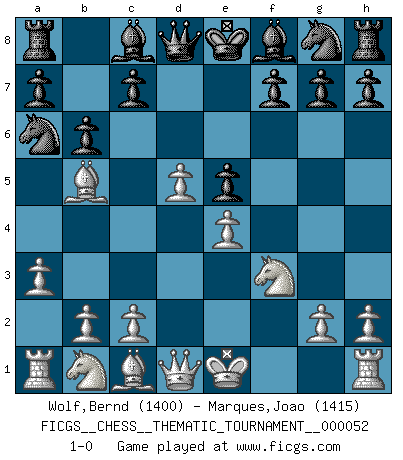 Last move : 1-0 2008 June 17 12:38:35 [Event "FICGS__CHESS__THEMATIC_TOURNAMENT__000052"] [Site "FICGS"] [Date "2008.06.09"] [Round "1"] [White "Wolf,Bernd"] [Black "Marques,Joao"] [Result "1-0"] [WhiteElo "1400"] [BlackElo "1415"] 1.f4 e5 2.fxe5 Nc6 3.Nf3 d6 4.d4 dxe5 5.d5 Nb4 6.e4 b6 7.a3 Na6 8.Bb5+ 1-0 Bird : From gambit Player White won this chess game. Follow this game move after move (download)You know you're going to lose. Even when I was ahead I knew I was going to lose. - On playing against Fischer. (Andrew Soltis) Warum muß ich gegen diesen IDIOTEN verlieren? (Aaron Nimzowitsch) Yo no creo en la psicología. Yo creo en las buenas movidas. (Bobby Fischer) Echiquier : carré parfait, comme la Jérusalem nouvelle décrite par l'auteur de l'Apocalypse, huit cases sur huit, exaltation du chiffre 4, symbole du cosmos aux quatre horizons... où le noir et le blanc, l'ombre et la lumière, le mal et le bien s'entremêlent et se conjuguent. (Robert Couffignal, Le Gambit du poète) 98% of all statistics are made up. (Author unknown)