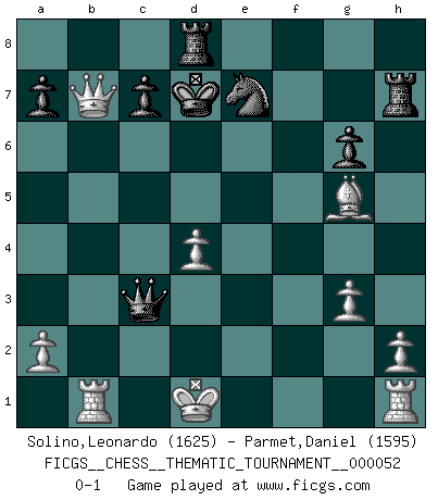 Last move : 0-1 2008 December 12 2:17:22 [Event "FICGS__CHESS__THEMATIC_TOURNAMENT__000052"] [Site "FICGS"] [Date "2008.06.09"] [Round "1"] [White "Solino,Leonardo"] [Black "Parmet,Daniel"] [Result "0-1"] [WhiteElo "1625"] [BlackElo "1595"] 1.f4 e5 2.fxe5 d6 3.exd6 Bxd6 4.Nf3 g5 5.g3 g4 6.Nh4 Ne7 7.Nc3 Ng6 8.Nxg6 hxg6 9.Ne4 f5 10.Nf2 Bc5 11.Bg2 Nc6 12.c3 Bxf2+ 13.Kxf2 Be6 14.d4 Bd5 15.e4 fxe4 16.Qxg4 Qf6+ 17.Ke1 Ne7 18.Bg5 Qb6 19.Qe2 Rh7 20.Kd1 O-O-O 21.Bxe4 Bxe4 22.Qxe4 Qxb2 23.Rb1 Qxc3 24.Qxb7+ Kd7 0-1 This chess game has been lost on time (started : 2008.06.09 11:27:47) Bird : From gambit, Lasker variation Queenside Castling by player Black (move 20) Player Black won this chess game. Follow this game move after move (download)I don't believe in psychology. I believe in good moves. (Bobby Fischer) Ich suche im Schach immer etwas Eigenes. Riskantes Spiel im Stile schachlicher Musketiere ist nicht meine Sache, auch wenn es vielen Freunden scharfer Wendungen gefällt. (Anatoly Karpov) ¿Que sería del Ajedrez sin errores graciosos?. (Kurt Richter) Seul un grand joueur sait à quel point il joue faiblement. (Xavier Tartacover) It is not titles that honor men, but men that honor titles. (Niccolo Machiavelli)
