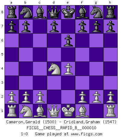 Last move : 1-0 2006 August 23 18:33:20 [Event "FICGS__CHESS__RAPID_B__000010"] [Site "FICGS"] [Date "2006.07.20"] [Round "1"] [White "Cameron,Gerald"] [Black "Cridland,Graham"] [Result "1-0"] [WhiteElo "1500"] [BlackElo "1547"] 1.e4 c5 2.Nf3 e6 3.d4 cxd4 4.Nxd4 1-0 This chess game has been lost on time (started : 2006.07.20 22:39:34) Sicilian defense Player White won this chess game. Follow this game move after move (download)You can only get good at Chess if you love the game. (Bobby Fischer) Ich kenne Menschen, die allen Willen der Welt besitzen und doch nicht Schach spielen können. (Robert James Fischer) Una partida de Ajedrez se divide en 3 etapas: la primera cuando piensas que tienes la ventaja, la segunda cuando crees que tienes la ventaja y la tercera... ¡cuando te das cuenta que vas a perder!. (Savielly Tartakower) Le succès, c'est être capable d'aller d'échec en échec sans perdre son enthousiasme. (Winston Churchill) Difficult things take a long time, impossible things a little longer. (Author unknown)
