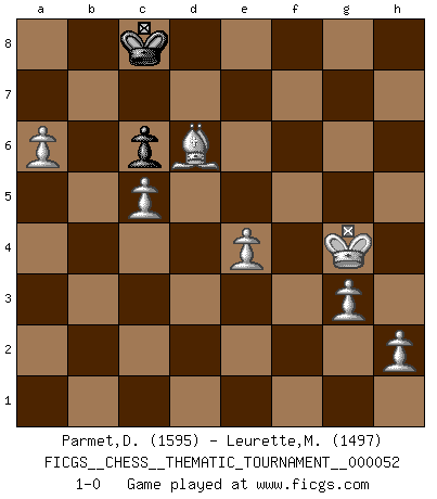Last move : 1-0 2008 August 18 18:19:8 [Event "FICGS__CHESS__THEMATIC_TOURNAMENT__000052"] [Site "FICGS"] [Date "2008.06.09"] [Round "1"] [White "Parmet,Daniel"] [Black "Leurette,Marc-Antoine"] [Result "1-0"] [WhiteElo "1595"] [BlackElo "1497"] 1.f4 e5 2.fxe5 d6 3.exd6 Bxd6 4.Nf3 g5 5.d4 g4 6.Ne5 Bxe5 7.dxe5 Qxd1+ 8.Kxd1 Nc6 9.Bf4 Bd7 10.e3 O-O-O 11.Nd2 f6 12.exf6 Nxf6 13.Bg5 Rhf8 14.Bd3 h5 15.Ke2 Rde8 16.Rhf1 Nd5 17.Rxf8 Rxf8 18.Rf1 Re8 19.Be4 Be6 20.c4 Ndb4 21.a3 Na6 22.Bxc6 bxc6 23.Kd3 Nc5+ 24.Kd4 Na4 25.b4 c5+ 26.bxc5 c6 27.Ne4 Nb2 28.Nd6+ Kd7 29.Nxe8 Kxe8 30.Rf6 Kd7 31.Rh6 Nxc4 32.Rxe6 Kxe6 33.Kxc4 Kf5 34.Bf4 h4 35.Kd4 h3 36.g3 a5 37.e4+ Ke6 38.a4 Kd7 39.Ke5 Ke7 40.Kf5 Kf7 41.Kxg4 Kf6 42.Kxh3 Kg6 43.Kg4 Kf6 44.Bc7 Kg6 45.Bxa5 Kf6 46.Bc7 Ke6 47.a5 Kd7 48.Bd6 Kc8 49.a6 1-0 Bird : From gambit, Lasker variation Queenside Castling by player Black (move 10) 10 pieces endgame at move 42 : White KBPPPPP , Black KPP WHITE : King + 1 Bishop 5 Pawns BLACK : King + 2 Pawns 9 pieces endgame at move 45 : White KBPPPPP , Black KP WHITE : King + 1 Bishop 5 Pawns BLACK : King + 1 Pawn Player White won this chess game. Follow this game move after move (download)Bobby Fischer is the greatest Chess player who has ever lived. (Ken Smith) Unter Putin wird alles Geld aus Russland wie von einem Staubsauger nach Moskau umgeleitet, das ist wie ein schwarzes Loch. (Garry Kasparov) El Ajedrez expande y enriquece tu mente. (Saudin Robovic) Lorsque vous vous retrouvez devant une position atroce, ne tendez pas un ultime piège dérisoire avec l'intention d'abandonner si l'adversaire le déjoue ! Faites-vous plutôt un devoir de résister comme si votre vie en dépendait. Jouez le coup qui vous déplairait au centuple si vous étiez dans la peau de votre tortionnaire ! The only sure thing about luck is that it will change. (Wilson Mizner)