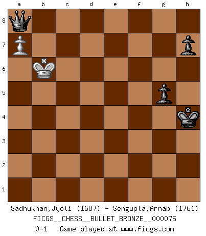 Last move : 0-1 2008 June 9 19:4:54 [Event "FICGS__CHESS__BULLET_BRONZE__000075"] [Site "FICGS"] [Date "2008.06.09"] [Round "1"] [White "Sadhukhan,Jyoti"] [Black "Sengupta,Arnab"] [Result "0-1"] [WhiteElo "1687"] [BlackElo "1761"] 1.d4 d5 2.e3 Nf6 3.Nc3 e5 4.dxe5 Ne4 5.Nxe4 dxe4 6.Qxd8+ Kxd8 7.f4 Be6 8.Ne2 Nc6 9.Nd4 Nxd4 10.exd4 c5 11.c3 cxd4 12.cxd4 Rc8 13.Be2 Bb4+ 14.Bd2 Bxd2+ 15.Kxd2 Ke7 16.Ke3 Rc2 17.b3 Rhc8 18.Bc4 Bxc4 19.bxc4 R8xc4 20.Kxe4 Rd2 21.Rhc1 R2xd4+ 22.Ke3 Re4+ 23.Kd3 Rcd4+ 24.Kc3 Rxf4 25.Kb3 Ke6 26.Rc7 Rd3+ 27.Rc3 Rd2 28.Rc2 Rxc2 29.Kxc2 Rf2+ 30.Kb3 Rxg2 31.Rh1 Kxe5 32.Re1+ Kf6 33.Rh1 Kg5 34.h4+ Kh5 35.a4 b6 36.Kb4 Rg4+ 37.Kb5 Rxh4 38.Rxh4+ Kxh4 39.Ka6 f5 40.Kxa7 f4 41.Kxb6 f3 42.a5 f2 43.a6 f1Q 44.a7 Qh1 45.Kc7 Qa8 46.Kb6 g5 0-1 Queen's pawn game 10 pieces endgame at move 37 : White KRP , Black KRPPPPP WHITE : King + 1 Rook 1 Pawn BLACK : King + 1 Rook 5 Pawns 9 pieces endgame at move 38 : White KRP , Black KPPPPP WHITE : King + 1 Rook 1 Pawn BLACK : King + 5 Pawns 8 pieces endgame at move 38 : White KP , Black KPPPPP WHITE : King + 1 Pawn BLACK : King + 5 Pawns 7 pieces endgame at move 40 : White KP , Black KPPPP WHITE : King + 1 Pawn BLACK : King + 4 Pawns 6 pieces endgame at move 41 : White KP , Black KPPP WHITE : King + 1 Pawn BLACK : King + 3 Pawns Promotion Queen by player Black (move 43) Player Black won this chess game. Follow this game move after move (download)We like to think. (Gary Kasparov) Später, ... hatte ich zunehmend Erfolg in entscheidenden Partien. Vielleicht weil ich eine einfache Wahrheit erkannte: nicht nur ich hatte Angst, auch mein Gegner. (Mikhail Nekhemyevich Tal) El Ajedrez es como la guerra en un tablero. (Bobby Fischer) Horreur, mais aussi harmonie suprême : qu'y avait-il en effet au monde en dehors des échecs ? Le brouillard, l'inconnu, le non-être... (Vladimir Nabokov) I've lost money so fast in these clubs it's left me reeling. I've read every poker book ever written, but the only way to get better at the game is to go out and play with people who are really good. The problem is, you stand to lose a lot of money doing it. (Matt Damon)
