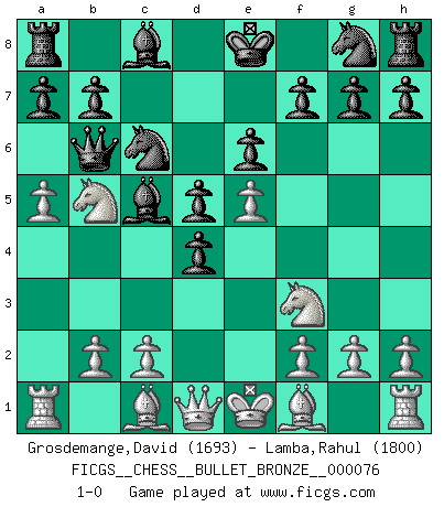Last move : 1-0 2009 February 25 17:20:31 [Event "FICGS__CHESS__BULLET_BRONZE__000076"] [Site "FICGS"] [Date "2009.02.25"] [Round "1"] [White "Grosdemange,David"] [Black "Lamba,Rahul"] [Result "1-0"] [WhiteElo "1693"] [BlackElo "1800"] 1.e4 e6 2.d4 d5 3.e5 c5 4.Nc3 Nc6 5.Nf3 Qb6 6.a4 cxd4 7.Nb5 Bc5 8.a5 1-0 This chess game has been lost on time (started : 2009.02.25 16:59:9) French : Advance variation Player White won this chess game. Follow this game move after move (download)By playing at Chess then, we may learn: First: Foresight... Second: Circumspection... Third: Caution... And lastly, we learn by Chess the habit of not being discouraged by present bad appearances in the state of our affairs, the habit of hoping for a favorable chance, and that of persevering in the secrets of resources. (Benjamin Franklin) Schach ist die gewalttätigste aller Sportarten. (Garry Kasparov) Si el Ajedrez es una ciencia, es la mas inexacta. Si el Ajedrez es un arte, es demasiado inexacto para ser visto como tal. Si el Ajedrez es un deporte, es demasiado esotérico. Si el Ajedrez es un juego, es demasiado exigente para ser solo un juego. Si el Ajedrez es una aventura, es una muy demandante. Si el Ajedrez es una pasión, es una muy gratificante. Si el Ajedrez es la vida, es una muy triste. (Anónimo) Fischer est le meilleur joueur du monde et Karpov n'est qu'un joueur de bistrot. (Garry Kasparov, agé de 16 ans) You lose, general Kenobi. (General Grievous in Star Wars ep.3)