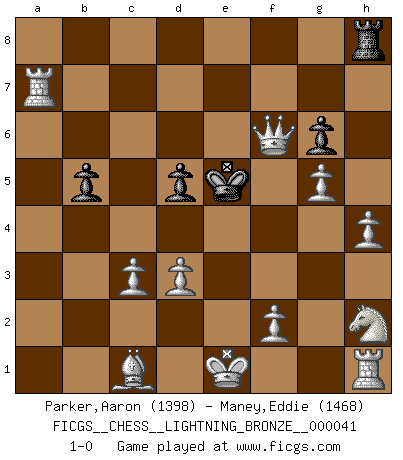Last move : 1-0 2009 January 18 1:23:5 [Event "FICGS__CHESS__LIGHTNING_BRONZE__000041"] [Site "FICGS"] [Date "2009.01.17"] [Round "1"] [White "Parker,Aaron"] [Black "Maney,Eddie"] [Result "1-0"] [WhiteElo "1398"] [BlackElo "1468"] 1.e4 e5 2.Nf3 f6 3.Bc4 h5 4.h4 Nh6 5.Nh2 c6 6.Qxh5+ Ke7 7.b3 b5 8.Bd3 Qe8 9.Qf3 Kd8 10.a4 a6 11.axb5 axb5 12.Rxa8 Na6 13.Qe3 Bc5 14.Qf3 Nb4 15.c3 Na6 16.b4 Bd6 17.Bc2 Nc7 18.Rb8 Ne6 19.Ra8 Kc7 20.Qe3 c5 21.bxc5 Bxc5 22.Qe2 Kb7 23.Ra1 Nc7 24.Na3 d6 25.Nb1 g6 26.Bb3 Be6 27.Bxe6 Qxe6 28.d3 f5 29.Nd2 fxe4 30.Nxe4 Nf5 31.Nxc5+ Kc6 32.Nxe6 Nxe6 33.Qe4+ Kd7 34.Ra7+ Nc7 35.g4 Ne7 36.g5 d5 37.Qxe5 Nc6 38.Qxc7+ Ke6 39.Qxc6+ Ke5 40.Qf6+ 1-0 Damiano's defense Player White won this chess game. Follow this game move after move (download)The game of chess is the touchstone of the intellect. (Goethe) Das Schach ist nichts für kleine Geister, es beansprucht einen vollen Mann, der sich nicht sklavisch an das Überlieferte hält, sondern selbständig die Tiefen des Spiels zu ergründen sucht. (Wilhelm Steinitz) Realmente no sabemos como el juego fue inventado, aunque hay sospechas. Tan pronto como descubramos a los culpables, se los haremos saber. (Bruce Pandolfini) La vie est comme un jeu d'échecs : nous esquissons un plan, mais celui-ci est tributaire de ce que daignent faire l'adversaire aux échecs et le destin dans la vie. (Arthur Schopenhauer) Locking firmely the window serves nothing, only small thiefs pass through there, the big thiefs enter through the front door. (Luc-Olivier Leclerc)