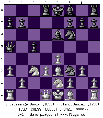 Last move : 0-1 2009 March 3 14:40:26 [Event "FICGS__CHESS__BULLET_BRONZE__000077"] [Site "FICGS"] [Date "2009.03.03"] [Round "1"] [White "Grosdemange,David"] [Black "Blanc,Daniel"] [Result "0-1"] [WhiteElo "1693"] [BlackElo "1750"] 1.e4 c5 2.c4 Nc6 3.Nc3 e6 4.g3 d5 5.cxd5 Nb4 6.a3 Qa5 7.dxe6 Bxe6 8.d3 Nf6 9.Be3 Nc6 10.Nge2 Rd8 11.Qc2 Nd4 12.Qd1 Nf3+ 0-1 This chess game has been lost on time (started : 2009.03.03 14:12:58) Sicilian defense Player Black won this chess game. Follow this game move after move (download)I look one move ahead... the best ! (Siegbert Tarrasch) Das Spiel gibt uns die Genugtuung, die das Leben uns versagt. (Emanuel Lasker) Las ideas audaces son como las piezas del Ajedrez que avanzan hacia adelante. Ellas pueden ser vencidas, pero también pueden iniciar una partida victoriosa. (Goethe) Aidez vos pièces, elles vous aideront. (Paul Morphy) If you are going through hell, keep going. (Winston Churchill)