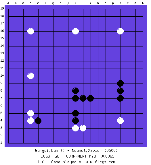 Last move : 1-0 2008 August 2 4:53:41 [Event "FICGS__GO__TOURNAMENT_KYU__000062"] [Site "FICGS"] [Date "2008.06.10"] [Round "1"] [Black "Gurgui,Dan"] [White "Nounet,Xavier"] [Result "1-0"] [Rating 2 "0600"] 1.k8 q16 2.q8 d16 3.q9 q4 4.q7 d4 5.e4 d5 6.k7 k3 7.k4 l3 8.k5 k16 9.l7 d10 10.m7 1-0 This go game has been lost on time (started : 2008.06.10 19:0:29) Here are the names of the openings (joseki) played in the four corners : Corner d4 : d4 e4 Hoshi (Hwajeom, Seongjeom, Xingwei`) 4-4 Point. The star or hoshi (4-4) point, emphasizing influence at the potential expense of territory. Player Black won this Go (weiqi, baduk) game. Follow this game move after move (download)Error is one of the sources of transformation. (Pierre Audouard) Luck is the residue of design. (John Milton)