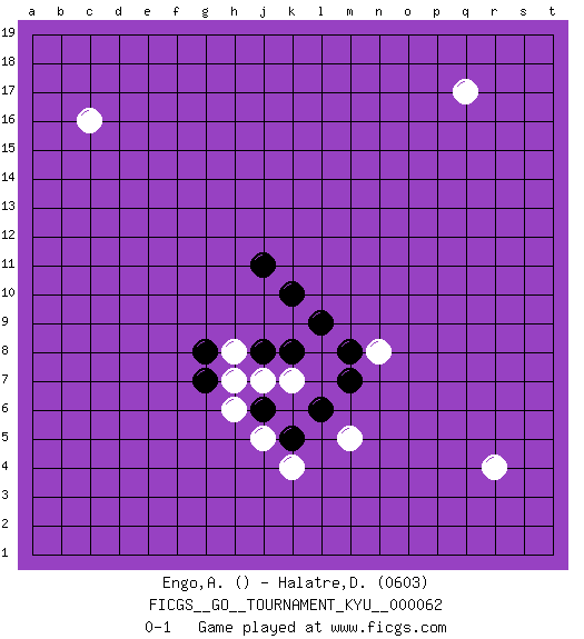 Last move : 0-1 2008 July 27 4:26:20 [Event "FICGS__GO__TOURNAMENT_KYU__000062"] [Site "FICGS"] [Date "2008.06.10"] [Round "1"] [Black "Engo,Arne Sigvald"] [White "Halatre,Didier"] [Result "0-1"] [Rating 2 "0603"] 1.j11 q17 2.l9 r4 3.k10 c16 4.m8 n8 5.m7 m5 6.l6 k7 7.j8 j7 8.k5 k4 9.k8 h8 10.g8 h7 11.j6 h6 12.g7 j5 0-1 This go game has been lost on time (started : 2008.06.10 19:0:29) Here are the names of the openings (joseki) played in the four corners : Corner q4 : l9 r4 This joseki is unknown. A weak or weird move has probably been played in this corner. Corner d16 : j11 c16 This joseki is unknown. A weak or weird move has probably been played in this corner. Corner d4 : j8 j7 This joseki is unknown. A weak or weird move has probably been played in this corner. Player White won this Go (weiqi, baduk) game. Follow this game move after move (download)Capture what you cut off. (Anonymous) Luck never made a man wise. (Seneca, Letters to Lucilius)
