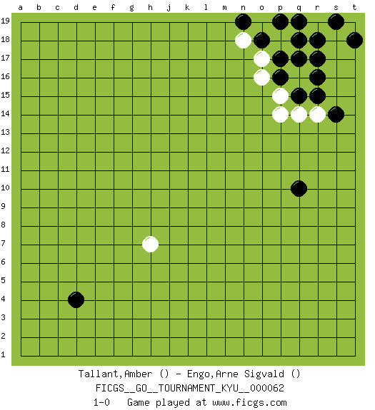 Last move : 1-0 2008 August 10 5:35:25 [Event "FICGS__GO__TOURNAMENT_KYU__000062"] [Site "FICGS"] [Date "2008.06.10"] [Round "1"] [Black "Tallant,Amber"] [White "Engo,Arne Sigvald"] [Result "1-0"] 1.d4 q16 2.r15 h7 3.q15 p15 4.r16 p14 5.p16 q17 6.p17 p18 7.q18 p19 8.r17 o16 9.q19 o17 10.o18 o19 11.n19 q16 12.q17 p18 13.p19 r19 14.s19 t19 15.t18 n18 16.r18 q14 17.q10 r14 18.s14 1-0 This go game has been lost on time (started : 2008.06.10 19:0:29) Here are the names of the openings (joseki) played in the four corners : Corner q16 : q16 r15 Hoshi (Hwajeom, Seongjeom, Xingwei`) 4-4 Point. The star or hoshi (4-4) point, emphasizing influence at the potential expense of territory. Corner d4 : d4 h7 Hoshi (Hwajeom, Seongjeom, Xingwei`) 4-4 Point. The star or hoshi (4-4) point, emphasizing influence at the potential expense of territory. Player Black won this Go (weiqi, baduk) game. Follow this game move after move (download)With less than 15 stones in danger, tenuki. (Anonymous) Over-the-board chess is the favorite of mortals, correspondence chess is the favorite of the gods. (Eduard Dyckhoff)