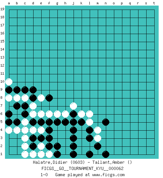 Last move : 1-0 2008 August 2 19:34:17 [Event "FICGS__GO__TOURNAMENT_KYU__000062"] [Site "FICGS"] [Date "2008.06.10"] [Round "1"] [Black "Halatre,Didier"] [White "Tallant,Amber"] [Result "1-0"] [Rating 1 "0603"] 1.d3 c4 2.c6 c5 3.d5 d6 4.c7 d4 5.e5 c3 6.d2 e4 7.b5 b6 8.b7 b4 9.a6 a4 10.a5 c2 11.e3 c1 12.f4 e6 13.f5 d1 14.e1 d7 15.d8 f6 16.f8 g6 17.g5 h6 18.h5 f1 19.f2 e2 20.f3 e1 21.g2 e8 22.g1 c8 23.d9 b8 24.c9 a8 25.b9 a10 26.a9 k4 27.k5 j5 28.j6 k6 29.j4 l5 30.j5 l6 31.l4 k3 32.j3 k2 33.j2 k1 34.j1 j7 35.l3 l2 36.m2 m1 37.n1 m3 38.l1 m4 39.n5 1-0 Here are the names of the openings (joseki) played in the four corners : Corner d4 : d3 c4 Komoku (Somok, Xiao~mu`) 3-4 Point. The komoku (3-4) point is the traditional corner enclosure move.. Player Black won this Go (weiqi, baduk) game. Follow this game move after move (download)There is damezumari at the bamboo joint. (Anonymous) Pushing plastic is for the many, pushing virtual pieces is for the fewer, pushing wood is for the very few. (Normajean Yates)
