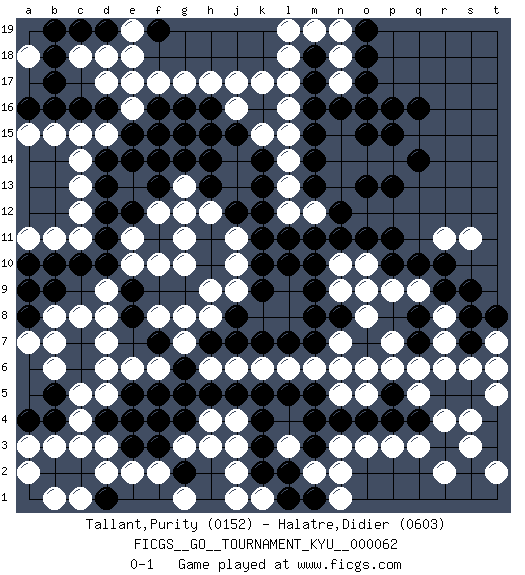 Last move : 0-1 2009 June 17 8:16:53 [Event "FICGS__GO__TOURNAMENT_KYU__000062"] [Site "FICGS"] [Date "2008.06.10"] [Round "1"] [Black "Tallant,Purity"] [White "Halatre,Didier"] [Result "0-1"] [Rating 1 "0152"] [Rating 2 "0603"] 1.q16 c5 2.q10 r4 3.d16 c14 4.d10 d3 5.k16 f17 6.b18 d15 7.c16 c13 8.b17 d18 9.b16 c8 10.c10 r8 11.e15 e16 12.f16 e17 13.d14 c15 14.b19 h17 15.f15 g17 16.e14 b15 17.a16 a15 18.d11 f10 19.d12 c12 20.d13 h15 21.h16 j16 22.g16 k17 23.j15 j17 24.h14 k15 25.g15 l16 26.h15 g12 27.b10 b11 28.a10 a11 29.k4 c11 30.e5 g3 31.g4 e6 32.f5 f6 33.g5 g13 34.h11 g11 35.h13 h12 36.j12 j11 37.h10 g10 38.k11 j10 39.k10 h9 40.k5 j6 41.j5 k6 42.h5 h3 43.k3 j2 44.e3 e2 45.f3 f2 46.d4 c4 47.c3 d2 48.c2 b3 49.b2 a2 50.d1 b1 51.b4 a3 52.a4 c1 53.b5 b6 54.c6 d6 55.c7 d7 56.b9 b7 57.a8 b8 58.a9 a7 59.g6 g7 60.k2 k1 61.l1 j1 62.l2 j3 63.h7 h6 64.j7 h8 65.j8 k8 66.k7 l6 67.l7 j9 68.k9 l8 69.m7 m6 70.m8 l9 71.l10 n7 72.m9 l13 73.q4 q3 74.r5 q5 75.p4 p3 76.r3 s4 77.s5 s3 78.t4 r2 79.p5 q6 80.q7 r7 81.r6 p6 82.n6 n5 83.m5 o6 84.l5 n6 85.n4 o3 86.o4 n3 87.m3 n2 88.m4 m2 89.m1 n1 90.t3 t2 91.k14 l14 92.k13 l12 93.f13 f12 94.e12 e10 95.f14 e11 96.e9 d9 97.e8 d8 98.m15 l15 99.k12 t5 100.m11 n10 101.n11 n9 102.n8 o8 103.q8 q9 104.r9 p9 105.s7 s6 106.s8 r6 107.s9 r11 108.r10 s11 109.p10 o10 110.o11 p7 111.m10 o9 112.p11 t7 113.t8 t6 114.m17 l17 115.m13 m12 116.n12 n13 117.m14 n14 118.m16 n15 119.n16 o16 120.o15 o14 121.p15 n17 122.m18 n18 123.o17 l18 124.p16 m19 125.o16 p14 126.q14 a18 127.p13 e4 128.f4 d5 129.o13 e4 130.o18 n19 131.d4 c3 132.o19 l19 133.f7 g8 134.d19 c18 135.pass pass 136.pass e19 137.pass e4 138.c19 d17 139.f19 e18 140.d4 h4 141.g2 g1 142.pass e4 143.g14 f8 144.d4 j4 145.e4 o5 146.l11 l3 0-1 This go game has been lost on time (started : 2008.06.10 19:0:29) Here are the names of the openings (joseki) played in the four corners : Corner d16 : d16 c14 Hoshi (Hwajeom, Seongjeom, Xingwei`) 4-4 Point. The star or hoshi (4-4) point, emphasizing influence at the potential expense of territory. Ikken Kakari (Hankan Keolch'im, Yi Gua`jiao~, 1-Space Low Approach). White 2 is the standard approach move to the 4-4. Corner q16 : q16 l16 Hoshi (Hwajeom, Seongjeom, Xingwei`) 4-4 Point. The star or hoshi (4-4) point, emphasizing influence at the potential expense of territory. Player White won this Go (weiqi, baduk) game. Follow this game move after move (download)Nothing requires doing this or that, but necessity exists. (Pierre Audouard) I believe in luck. How else can you explain the success of those you dislike ? (Jean Cocteau)