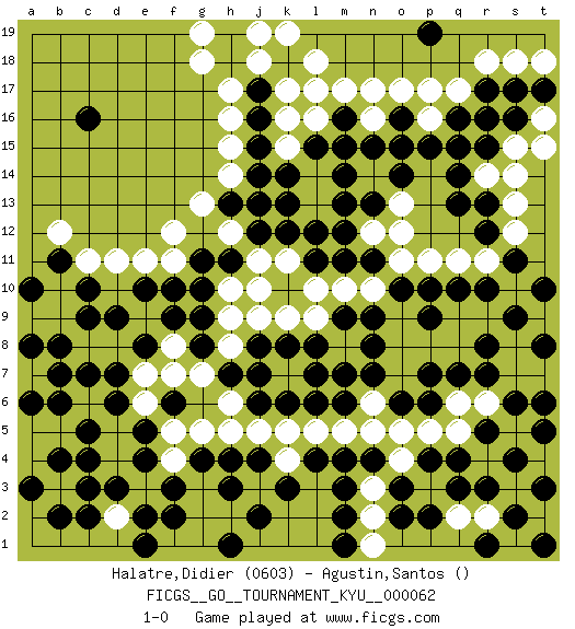 Last move : 1-0 2008 October 21 17:0:0 [Event "FICGS__GO__TOURNAMENT_KYU__000062"] [Site "FICGS"] [Date "2008.06.10"] [Round "1"] [Black "Halatre,Didier"] [White "Agustin,Santos"] [Result "1-0"] [Rating 1 "0603"] 1.d3 d5 2.c5 c6 3.c4 b5 4.b4 b3 5.b2 d4 6.c3 a4 7.a3 a5 8.b6 b7 9.a6 a7 10.c7 c8 11.d6 e6 12.d7 f7 13.b8 b9 14.a8 a9 15.b7 d8 16.c16 e3 17.k3 d2 18.f3 g3 19.e4 f4 20.e2 g2 21.e5 f5 22.h4 e7 23.f2 f1 24.e1 g1 25.c2 k4 26.l4 k5 27.q4 q5 28.r5 p5 29.p4 o4 30.o3 n3 31.n4 o5 32.m3 n2 33.o2 l5 34.m2 j3 35.j4 j5 36.h3 h2 37.j2 m5 38.m4 n5 39.g4 g5 40.h1 h5 41.h7 h9 42.k8 r4 43.r3 s3 44.s4 p3 45.p2 q2 46.q3 r2 47.s2 t2 48.t3 s1 49.t1 r6 50.r1 s5 51.s6 s7 52.t5 t7 53.t6 n1 54.m1 j7 55.j8 j9 56.l8 l9 57.l11 k9 58.n7 m8 59.m9 n10 60.n9 o9 61.m7 m10 62.n8 h8 63.j6 k7 64.k6 h6 65.l7 o8 66.j7 o7 67.r8 r9 68.s9 s10 69.r10 q9 70.r7 q6 71.s11 t9 72.t10 s8 73.t8 q8 74.q7 n6 75.p7 g7 76.e8 e9 77.q10 f8 78.p6 p8 79.o10 o11 80.p10 p11 81.o6 q11 82.p9 r11 83.n11 n12 84.m11 l10 85.k10 k11 86.k12 j11 87.c10 j10 88.l12 l13 89.k13 j13 90.m13 l14 91.n13 o13 92.k14 k15 93.m12 o12 94.m14 m15 95.l15 n14 96.n15 l16 97.m16 l17 98.j17 n16 99.o14 o15 100.o16 n17 101.p15 m17 102.m15 k17 103.f10 f11 104.g11 f12 105.e10 e11 106.d9 h12 107.f9 j18 108.h18 h17 109.j16 h16 110.j15 k16 111.k18 j19 112.h19 h15 113.j14 g18 114.j12 g19 115.g9 h14 116.h13 o17 117.g8 b10 118.c9 c11 119.e8 s12 120.q13 p16 121.o15 q15 122.q14 r14 123.q16 p17 124.r15 d11 125.b11 b12 126.a10 g13 127.j13 s14 128.r13 s13 129.r12 s15 130.s16 t16 131.s17 t15 132.t17 q17 133.r17 r18 134.p19 l18 135.l6 k19 136.h11 h10 137.g10 s18 138.r16 t18 139.q15 pass 140.pass pass 141.pass pass 142.m6 pass 143.f6 1-0 Here are the names of the openings (joseki) played in the four corners : Corner d4 : d3 d5 Komoku (Somok, Xiao~mu`) 3-4 Point. The komoku (3-4) point is the traditional corner enclosure move.. Ikken Takagakari (Hankan Nop'dakeolch'im, Yi Gaogua`jiao~, 1-Space High Approach). The 5-4 approach move has become more popular in modern times, as modern Go emphasizes speed and influence. Corner d16 : c16 j11 Komoku (Somok, Xiao~mu`) 3-4 Point. The komoku (3-4) point is the traditional corner enclosure move.. Player Black won this Go (weiqi, baduk) game. Follow this game move after move (download)The game plays itself, the players don't control it. (Pierre Audouard) When you have everything, sometimes it feels like nothing. (Horatio Caine, C.S.I. Miami)