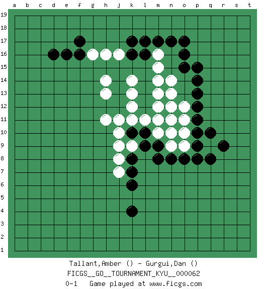 Last move : 0-1 2008 September 21 22:14:50 [Event "FICGS__GO__TOURNAMENT_KYU__000062"] [Site "FICGS"] [Date "2008.06.10"] [Round "1"] [Black "Tallant,Amber"] [White "Gurgui,Dan"] [Result "0-1"] 1.q10 o10 2.p9 q9 3.p10 o9 4.o8 o11 5.q8 n9 6.r9 o12 7.p8 n10 8.n8 n11 9.p11 n12 10.m9 m10 11.m8 m11 12.p12 m12 13.p13 m13 14.l9 n13 15.l10 m14 16.p14 m15 17.p15 m16 18.o15 l11 19.d16 n14 20.e16 k11 21.k10 k12 22.k16 j16 23.f16 g16 24.f17 h16 25.l16 k14 26.k17 j10 27.o16 j11 28.o17 j9 29.n17 h14 30.m17 k13 31.l17 j8 32.k4 j7 33.k7 h11 34.k6 k9 35.k8 h13 0-1 This go game has been lost on time (started : 2008.06.10 19:0:29) Here are the names of the openings (joseki) played in the four corners : Corner q4 : p9 q9 This joseki is unknown. A weak or weird move has probably been played in this corner. Player White won this Go (weiqi, baduk) game. Follow this game move after move (download)If a formation is symmetrical, play at the center. (Anonymous) It is a good thing for an uneducated man to read books of quotations. (Winston Churchill)