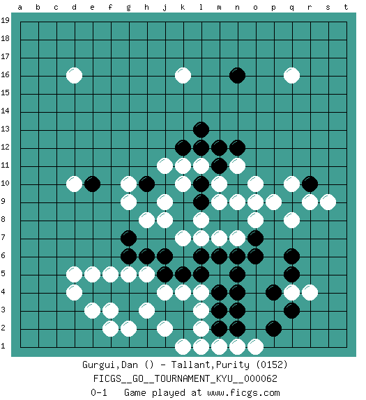 Last move : 0-1 2008 October 20 0:18:13 [Event "FICGS__GO__TOURNAMENT_KYU__000062"] [Site "FICGS"] [Date "2008.06.10"] [Round "1"] [Black "Gurgui,Dan"] [White "Tallant,Purity"] [Result "0-1"] [Rating 2 "0152"] 1.n6 k4 2.g4 d4 3.k9 g2 4.k2 h3 5.h4 j4 6.e4 h5 7.f4 e3 8.k3 l4 9.m4 l3 10.m3 l2 11.j5 l1 12.l5 e5 13.h6 g5 14.j3 j2 15.k5 k1 16.g6 f5 17.n4 d5 18.g3 f2 19.p4 f3 20.j6 d16 21.o6 q16 22.n3 k16 23.m2 m1 24.n2 n1 25.p2 q10 26.g7 o1 27.l6 d10 28.k8 g9 29.h10 g10 30.q9 k10 31.l10 l11 32.l12 k11 33.l9 m10 34.m9 n9 35.l13 h8 36.l8 l7 37.k12 j11 38.r10 p9 39.n8 o9 40.m8 n7 41.n5 o8 42.n16 m7 43.o7 q4 44.e10 k7 45.q5 r4 46.q3 r9 47.m6 j8 48.m11 j9 49.q6 s9 50.l9 l8 51.m12 q8 52.l10 m9 53.n10 n11 54.n12 o10 0-1 This go game has been lost on time (started : 2008.06.10 19:0:29) Here are the names of the openings (joseki) played in the four corners : Corner d4 : g4 d4 This joseki is unknown. A weak or weird move has probably been played in this corner. Corner q4 : n6 l4 This joseki is unknown. A weak or weird move has probably been played in this corner. Player White won this Go (weiqi, baduk) game. Follow this game move after move (download)Don't make territory near thickness. (Anonymous) The real danger is not that computers will begin to think like men, but that men will begin to think like computers. (Sydney J. Harris)