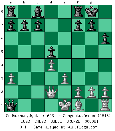 Last move : 0-1 2008 June 11 21:29:58 [Event "FICGS__CHESS__BULLET_BRONZE__000081"] [Site "FICGS"] [Date "2008.06.11"] [Round "1"] [White "Sadhukhan,Jyoti"] [Black "Sengupta,Arnab"] [Result "0-1"] [WhiteElo "1603"] [BlackElo "1816"] 1.d4 d5 2.Nf3 Nf6 3.c4 e6 4.cxd5 exd5 5.Bg5 Bb4+ 6.Nc3 O-O 7.a3 Bxc3+ 8.bxc3 h6 9.Bh4 Nc6 10.Ne5 Qd6 11.Bxf6 Qxf6 12.Nxc6 Qxc6 13.e3 Qxc3+ 14.Qd2 Qxa1+ 0-1 Queen's pawn game Kingside Castling by player Black (move 6) Player Black won this chess game. Follow this game move after move (download)Place the contents of the Chess box in a hat, shake them up vigorously, pour them on the board from a height of two feet, and you get the style of Steinitz. (H. E. Bird) Wenn du nicht weißt was du tun sollst, warte bis dein Gegner eine Idee hat. Sie wird sicher schlecht sein. (Siegbert Tarrasch) Cada Peón es una Reina en potencia. (James Mason) Toutes les manuvres exécutées sur une colonne ouverte ont pour but ultime l'intrusion définitive sur la septième ou la huitième rangée, en plein cur de la position ennemie. (Aaron Nimzovitch) The greatest con, that he ever pulled... was making you believe... that he is you. (Revolver, movie)