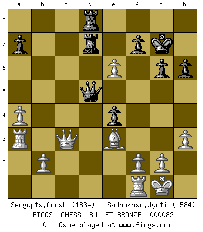 Last move : 1-0 2008 June 12 0:3:26 [Event "FICGS__CHESS__BULLET_BRONZE__000082"] [Site "FICGS"] [Date "2008.06.11"] [Round "1"] [White "Sengupta,Arnab"] [Black "Sadhukhan,Jyoti"] [Result "1-0"] [WhiteElo "1834"] [BlackElo "1584"] 1.d4 d5 2.c4 e6 3.Nc3 Nc6 4.cxd5 exd5 5.Nf3 Bb4 6.e3 Nf6 7.Bb5 Bd7 8.O-O O-O 9.Qa4 Bd6 10.e4 Nxe4 11.Nxe4 dxe4 12.Ne5 Nxe5 13.dxe5 Bxb5 14.Qxb5 Be7 15.Qxb7 Qd4 16.Qxc7 Rfd8 17.Qxe7 Rd7 18.Be3 Qd3 19.Qb4 Rad8 20.h3 g6 21.a4 Kg7 22.Ra3 Qd5 23.Qc3 h6 24.e6 1-0 This chess game has been lost on time (started : 2008.06.11 21:30:33) QGD : 3.Nc3 Kingside Castling by player White (move 8) Kingside Castling by player Black (move 8) Player White won this chess game. Follow this game move after move (download)We cannot resist the fascination of sacrifice, since a passion for sacrifices is part of a Chessplayer's nature. (Rudolf Spielman) Im Blitz ist es einfacher mit einer Figur weniger anzugreifen, als sich mit einer Mehrfigur zu verteidigen. (Mikhail Nekhemyevich Tal) Un jugador que trata de regresar una movida en el Ajedrez es un futuro carterista. (Richard Fenton) Le pion, dans sa simplicité, marche droit devant lui, mais lorsqu'il prend, il le fait obliquement? Ainsi l'homme, tant qu'il reste pauvre, marche dans la droiture et vit honnêtement, mais lorsqu'il recherche les honneurs, il flatte, se parjure et, par les voies obliques, cherche une position supérieure sur l'échiquier du monde. (Jean de Galles) I find your interest interesting. (Gregory House, House M.D.)