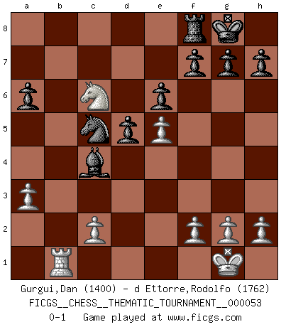 Last move : 0-1 2008 June 29 10:32:50 [Event "FICGS__CHESS__THEMATIC_TOURNAMENT__000053"] [Site "FICGS"] [Date "2008.06.12"] [Round "1"] [White "Gurgui,Dan"] [Black "d Ettorre,Rodolfo"] [Result "0-1"] [WhiteElo "1400"] [BlackElo "1762"] 1.e4 Nf6 2.Nc3 d5 3.e5 Nfd7 4.d4 e6 5.Be3 c5 6.Bb5 Nc6 7.Bxc6 bxc6 8.Nf3 Ba6 9.a3 Rb8 10.b4 cxd4 11.Bxd4 c5 12.bxc5 Bxc5 13.Bxc5 Nxc5 14.Ne2 Qa5+ 15.Qd2 Qc7 16.O-O Ne4 17.Qd1 Qc5 18.Qd4 Bxe2 19.Qxc5 Nxc5 20.Rfb1 O-O 21.Nd4 Bc4 22.Nc6 Rxb1+ 23.Rxb1 a6 0-1 Alekhine's defense : Scandinavian variation Kingside Castling by player White (move 16) Kingside Castling by player Black (move 20) Player Black won this chess game. Follow this game move after move (download)In order to improve your game, you must study the endgame before everything else, for whereas the endings can be studied and mastered by themselves, the middle game and the opening must be studied in relation to the endgame. (Jose Raul Capablanca) Sicherlich können nur Meister einen Stil haben. Daß ein nicht-Meister auch nur ein einziges Mal in seinem Leben eine Partie folgerecht durchführte, habe ich niemals bemerkt. (Emanuel Lasker) El Rey es una pieza de pelea. ¡Usenlo!. (Wilhelm Steinitz) Un footballeur joue avec ses pieds, parfois avec sa tête. Un joueur d'échecs ne joue qu'avec sa tête. Et quand il ne joue plus, il meurt. (Jacob Murray) Kids, you tried your best and you failed miserably. The lesson is, never try. (Simpsons)