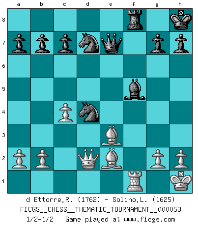 Last move : 1/2-1/2 2008 October 7 3:16:19 [Event "FICGS__CHESS__THEMATIC_TOURNAMENT__000053"] [Site "FICGS"] [Date "2008.06.12"] [Round "1"] [White "d Ettorre,Rodolfo"] [Black "Solino,Leonardo"] [Result "1/2-1/2"] [WhiteElo "1762"] [BlackElo "1625"] 1.e4 Nf6 2.e5 Nd5 3.c4 Nb6 4.d4 d6 5.f4 dxe5 6.fxe5 Nc6 7.Be3 Bf5 8.Nc3 e6 9.Nf3 Be7 10.Be2 O-O 11.O-O f6 12.exf6 Bxf6 13.Qd2 Qe7 14.Rad1 Rad8 15.Qc1 Rd7 16.Kh1 Kh8 17.d5 exd5 18.Nxd5 Qf7 19.Nxf6 Qxf6 20.Rxd7 Nxd7 21.Qd2 Qe7 22.Nd4 Nxd4 1/2-1/2 Alekhine's defense Kingside Castling by player Black (move 10) Kingside Castling by player White (move 11) This chess game ended in a draw. Follow this game move after move (download)I play correspondence chess because it is both art and science while chess is art only. (A player at FICGS) Ich verstehe mehr vom Schach als irgendein anderer lebender Meister. (José Raúl Capablanca) El Ajedrez, como la música, como el amor, tiene el poder de hacer feliz a la gente. (Siegbert Tarrasch) Botvinnik disait en comparant les échecs à la musique: Il existe une science dont le but est l'étude de l'acoustique et des sons. Mais il y a aussi un art qui se sert de l'océan des sons : c'est la musique. De toute évidence, il en est de même pour la pensée. La logique est l'étude des lois de la réflexion et les échecs reflètent, en tant qu'art, le côté logique de la réflexion, sous la forme d'images artistiques... Extrait de Fischer - Spassky, Reykjavik 1972 par Alexander & F. Wyndham (Ed. Solar), p 37. The beginning of wisdom is silence. The second step is listening. (Unknown)