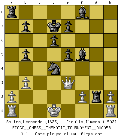 Last move : 0-1 2008 December 4 22:48:59 [Event "FICGS__CHESS__THEMATIC_TOURNAMENT__000053"] [Site "FICGS"] [Date "2008.06.12"] [Round "1"] [White "Solino,Leonardo"] [Black "Cirulis,Ilmars"] [Result "0-1"] [WhiteElo "1625"] [BlackElo "1503"] 1.e4 Nf6 2.e5 Nd5 3.d4 d6 4.Nf3 Nc6 5.c4 Nb6 6.e6 fxe6 7.Ng5 e5 8.Bd3 Nxd4 9.Qh5+ g6 10.Bxg6+ hxg6 11.Qxg6+ Kd7 12.Nf7 Nxc4 13.Nxd8 Kxd8 14.b3 Bf5 15.Qf7 Nb6 16.Be3 Rh7 17.Qg8 Nc2+ 18.Ke2 Kd7 19.Bxb6 axb6 20.Nc3 Rg7 21.Qc4 Rg4 22.Qf7 Bg6 23.Qd5 Nd4+ 24.Kd1 c6 25.Qc4 b5 26.Nxb5 cxb5 27.Qc3 Bf5 28.Qe3 Rxg2 0-1 This chess game has been lost on time (started : 2008.06.12 13:7:0) Alekhine's defense : Modern variation Player Black won this chess game. Follow this game move after move (download)The hardest game to win is a won game. (Emanuel Lasker) Mein Gehirn das ist mein zweitwichtigstes Organ [Aus dem Film: Der Schläfer]. (Woody Allen) Preferería tener un Peón que un dedo. (Reuben Fine) Aux échecs, l'amour-propre est satisfait quand on remporte la victoire, mais il n'y a pas de honte à être battu. (Benjamin Franklin) Wisdom is the reward you get for a lifetime of listening when you'd have preferred to talk. (Doug Larson)