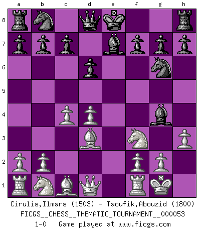 Last move : 1-0 2008 August 1 4:52:5 [Event "FICGS__CHESS__THEMATIC_TOURNAMENT__000053"] [Site "FICGS"] [Date "2008.06.12"] [Round "1"] [White "Cirulis,Ilmars"] [Black "Taoufik,Abouzid"] [Result "1-0"] [WhiteElo "1503"] [BlackElo "1800"] 1.e4 Nf6 2.e5 Nd5 3.c4 Nf4 4.d4 Ng6 5.Nf3 d6 6.exd6 exd6 7.Bd3 Be7 8.O-O Bg4 9.h3 1-0 This chess game has been lost on time (started : 2008.06.12 13:7:0) Alekhine's defense Kingside Castling by player White (move 8) Player White won this chess game. Follow this game move after move (download)The isolated Pawn casts gloom over the entire chessboard. (Aaron Nimzovich) Der Verteidiger gebe der Gewalt nach, aber nur der Gewalt. Er schaffe sich nicht freiwillig, etwa aus Blindheit oder aus Schrecken, irgendwelche Schwächen. Er lasse sich nicht bluffen. (Emanuel Lasker) Hasta este punto, las blancas han seguido un análisis bien conocido. Pero ahora el hace un error fatal: empieza a usar su propia cabeza. (Siegbert Tarrasch) Horreur, mais aussi harmonie suprême : qu'y avait-il en effet au monde en dehors des échecs ? Le brouillard, l'inconnu, le non-être... (Vladimir Nabokov) Perception is reality. (Immanuel Kant)