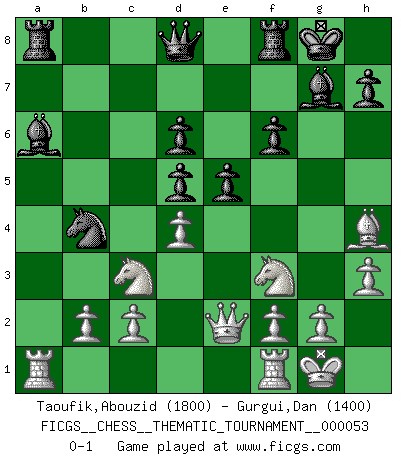 Last move : 0-1 2008 September 6 20:48:12 [Event "FICGS__CHESS__THEMATIC_TOURNAMENT__000053"] [Site "FICGS"] [Date "2008.06.12"] [Round "1"] [White "Taoufik,Abouzid"] [Black "Gurgui,Dan"] [Result "0-1"] [WhiteElo "1800"] [BlackElo "1400"] 1.e4 Nf6 2.e5 Nd5 3.Nf3 d6 4.Bc4 e6 5.d4 c6 6.O-O b5 7.Bxd5 cxd5 8.Nc3 a6 9.Bg5 f6 10.exf6 gxf6 11.Bh4 Bg7 12.Qe2 O-O 13.h3 Nc6 14.a4 e5 15.axb5 Nb4 16.bxa6 Bxa6 0-1 This chess game has been lost on time (started : 2008.06.12 13:7:0) Alekhine's defense Kingside Castling by player White (move 6) Kingside Castling by player Black (move 12) Player Black won this chess game. Follow this game move after move (download)Adequate compensation for a sacrifice is having a sound combination leading to a winning position; adequate compensation for a blunder is having your opponent snatch defeat from the jaws of victory. (Bruce A. Moon) Über die Verhaftung Bobby Fischers: Warum es die Bush-Administration für nötig befindet einen 61 Jahre alten Mann zu hetzten, der für niemanden ausser sich selbste eine Gefahr darstellt ist ein Rätsel. (Nigel Short) El Ajedrez es en su esencia, un juego. En su forma, un arte. Y en su ejecución, una ciencia. (Baron Tassilo) Les pièces de l'échiquier étaient impitoyables. Elles le retenaient, elles l'absorbaient. Il y avait de l'horreur en cela, mais aussi une harmonie unique. Car, qu'y a-t-il dans le monde, à part les échecs ? (V. Nabokov) If everyone is thinking alike, then somebody isn't thinking. (US General George S. Patton)
