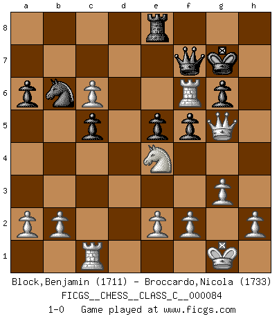 Last move : 1-0 2008 July 30 17:39:36 [Event "FICGS__CHESS__CLASS_C__000084"] [Site "FICGS"] [Date "2008.06.12"] [Round "1"] [White "Block,Benjamin"] [Black "Broccardo,Nicola"] [Result "1-0"] [WhiteElo "1711"] [BlackElo "1733"] 1.d4 Nf6 2.Nf3 g6 3.c4 Bg7 4.g3 d6 5.Bg2 Bg4 6.O-O O-O 7.Nc3 Qd7 8.Ng5 h6 9.Bxb7 hxg5 10.Bxa8 c6 11.Qa4 Qc7 12.Bxg5 Re8 13.d5 Nfd7 14.c5 dxc5 15.Qxg4 Nb6 16.Bf4 Be5 17.Bxe5 Qxe5 18.Bxc6 Nxc6 19.dxc6 a6 20.Rfd1 e6 21.Rac1 Qc7 22.Ne4 Kg7 23.Rd6 f5 24.Qf4 e5 25.Qg5 Qf7 26.Rf6 1-0 King's Indian : East Indian defense Kingside Castling by player White (move 6) Kingside Castling by player Black (move 6) Player White won this chess game. Follow this game move after move (download)When you play Bobby, it is not a question if you win or lose. It is a question if you survive. (Boris Spassky) Der Freibauer hat für mich eine Seele, genau wie der Mensch, Wünsche, die unerkannt in ihm schlummern, und Befürchtungen, von deren Existenz er selbst kaum ahnt. (Aaron Nimzowitsch) Hay dos clases de hombres: aquellos que se conforman en dejarse llevar por las circunstancias y que juegan barajas y aquellos decididos a controlar las circunstancias y que juegan al Ajedrez. (Mortimer Collins) Je ne crois pas en la psychologie, je crois aux bons coups. (Robert Fischer) All battles are fought by scared men who'd rather be someplace else. (John Wayne in the movie In harm's way)
