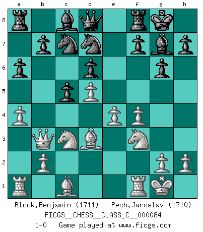 Last move : 1-0 2008 October 16 23:39:26 [Event "FICGS__CHESS__CLASS_C__000084"] [Site "FICGS"] [Date "2008.06.12"] [Round "1"] [White "Block,Benjamin"] [Black "Pech,Jaroslav"] [Result "1-0"] [WhiteElo "1711"] [BlackElo "1710"] 1.d4 Nf6 2.c4 c5 3.d5 e6 4.Nc3 exd5 5.cxd5 d6 6.e4 g6 7.f4 Bg7 8.Bb5+ Nfd7 9.a4 O-O 10.Nf3 Na6 11.O-O Nc7 12.Bd3 a6 13.Qb3 1-0 This chess game has been lost on time (started : 2008.06.12 13:7:56) Benoni : pawn storm variation Kingside Castling by player Black (move 9) Kingside Castling by player White (move 11) Player White won this chess game. Follow this game move after move (download)One of these modest little moves may be more embarrassing to your opponent than the biggest threat. (Siegbert Tarrasch) Wie ich sie so einen nach dem anderen nieder mähte wurde meine Überlegenheit offensichtlich. (José Raúl Capablanca) Cuando tu no sabes absolutamente que mas hacer, es tiempo de entrar en pánico. (John van der Wiel) On a dit que l'homme se distingue de l'animal par le fait qu'il achète plus de livres qu'il ne peut en lire. Je voudrais suggérer qu'inclure à la liste des livres quelques livres d'échecs rendrait la distinction manifeste. (Edward Lasker) Depression is just anger without enthusiasm. (Unknown)