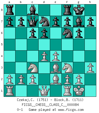 Last move : 0-1 2008 August 3 4:54:56 [Event "FICGS__CHESS__CLASS_C__000084"] [Site "FICGS"] [Date "2008.06.12"] [Round "1"] [White "Czekaj,Christophe"] [Black "Block,Benjamin"] [Result "0-1"] [WhiteElo "1751"] [BlackElo "1711"] 1.d4 Nf6 2.Nf3 g6 3.Nc3 Bg7 4.e4 d6 5.Be2 O-O 6.O-O c6 7.h3 Nbd7 8.Be3 Qc7 0-1 This chess game has been lost on time (started : 2008.06.12 13:7:56) King's Indian : East Indian defense Kingside Castling by player Black (move 5) Kingside Castling by player White (move 6) Player Black won this chess game. Follow this game move after move (download)When you are lonely, when you feel yourself an alien in the world, play Chess. This will raise your spirits and be your counselor in war. (Aristotle) Schach ist Leben. (Robert James Fischer) Botvinnik trató de alejar el misterio referente al Ajedrez, siempre relacionandolo a situaciones de la vida diaria. Solía llamar al Ajedrez un problema inexacto típico, similar a aquellos en que la gente tiene siempre que resolver a cada día. (Garry Kasparov) Je ne suis pas le dernier à jouer lâchement des coups douteux pendant le zeïtnot de l'adversaire pour l'achever: en effet les coups qui font le plus peur sont ceux que l'on ne comprend pas. Je me fais souvent peur quand je joue. (Un professeur anonyme) Winning isn't everything... but losing is nothing. (Mednis)