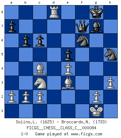 Last move : 1-0 2008 August 27 9:22:29 [Event "FICGS__CHESS__CLASS_C__000084"] [Site "FICGS"] [Date "2008.06.12"] [Round "1"] [White "Solino,Leonardo"] [Black "Broccardo,Nicola"] [Result "1-0"] [WhiteElo "1625"] [BlackElo "1733"] 1.e4 d6 2.d4 Nf6 3.Nc3 g6 4.f4 Bg7 5.Nf3 O-O 6.Bd3 c6 7.O-O Bg4 8.h3 Bxf3 9.Qxf3 Nbd7 10.Be3 e5 11.dxe5 dxe5 12.Rad1 Qc7 13.f5 b6 14.Bc4 Rad8 15.fxg6 hxg6 16.Qg3 Nh5 17.Rxf7 Rxf7 18.Qxg6 Ndf6 19.Qxf7+ Qxf7 20.Rxd8+ 1-0 Pirc : Austrian attack, 6.Bd3 Kingside Castling by player Black (move 5) Kingside Castling by player White (move 7) Player White won this chess game. Follow this game move after move (download)Dazzling combinations are for the many, shifting wood is for the few. (Georg Kieninger) Das Schach hält seine Meister in eigenen Banden, Fesseln; auf vielerlei Weise formt es ihren Geist, so dass die innere Freiheit selbst des Stärksten beeinflusst wird. (Albert Einstein) Un jugador que trata de regresar una movida en el Ajedrez es un futuro carterista. (Richard Fenton) C'est une question de caractère, Beaucoup de gens perdent leur motivation très vite. D'autres, ils sont rares, peuvent la conserver très longtemps. J'aime les échecs, encore aujourd'hui je suis heureux d'analyser des parties. J'aime toujours gagner, je déteste encore perdre. Bien jouer est important pour mon intégrité intellectuelle et morale. Et puis les échecs vivent en ce moment une période historique grâce à Internet. Ils se développent dans les systèmes éducatifs à travers le monde. Ils sortent de leur ghetto, et c'est mon rôle de mener à bien cette révolution. (Gary Kasparov) The real voyage of discovery consists not in seeking new lands but in seeing with new eyes. (Marcel Proust)