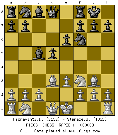 Last move : 0-1 2006 August 15 19:17:52 [Event "FICGS__CHESS__RAPID_A__000003"] [Site "FICGS"] [Date "2006.07.21"] [Round "1"] [White "Fioravanti,Diego"] [Black "Starace,Umberto"] [Result "0-1"] [WhiteElo "2132"] [BlackElo "1952"] 1.d4 Nf6 2.Nf3 e6 3.Bf4 d5 4.e3 Bd6 5.Bg3 O-O 6.Bd3 c5 7.dxc5 Bxc5 0-1 Queen's pawn game Kingside Castling by player Black (move 5) Player Black won this chess game. Follow this game move after move (download)You cannot play at Chess if you are kind-hearted. (French Proverb) Darum geht es im Schach. Einen Tag gibst du deinem Gegner eine Lektion, am nächsten Tag gibt er dir eine. (Robert James Fischer) El Ajedrez es una guerra en un tablero. El objetivo es aplastar la mente del oponente. (Bobby Fischer) Le moment que je préfère le plus dans une rencontre, c'est celui où je sens que la personnalité de l'adversaire se brise. (Robert Fischer) Now you put water in a cup, it becomes the cup; You put water into a bottle it becomes the bottle; You put it in a teapot it becomes the teapot. Water can flow or it can crash. Be water, my friend. (Bruce Lee)